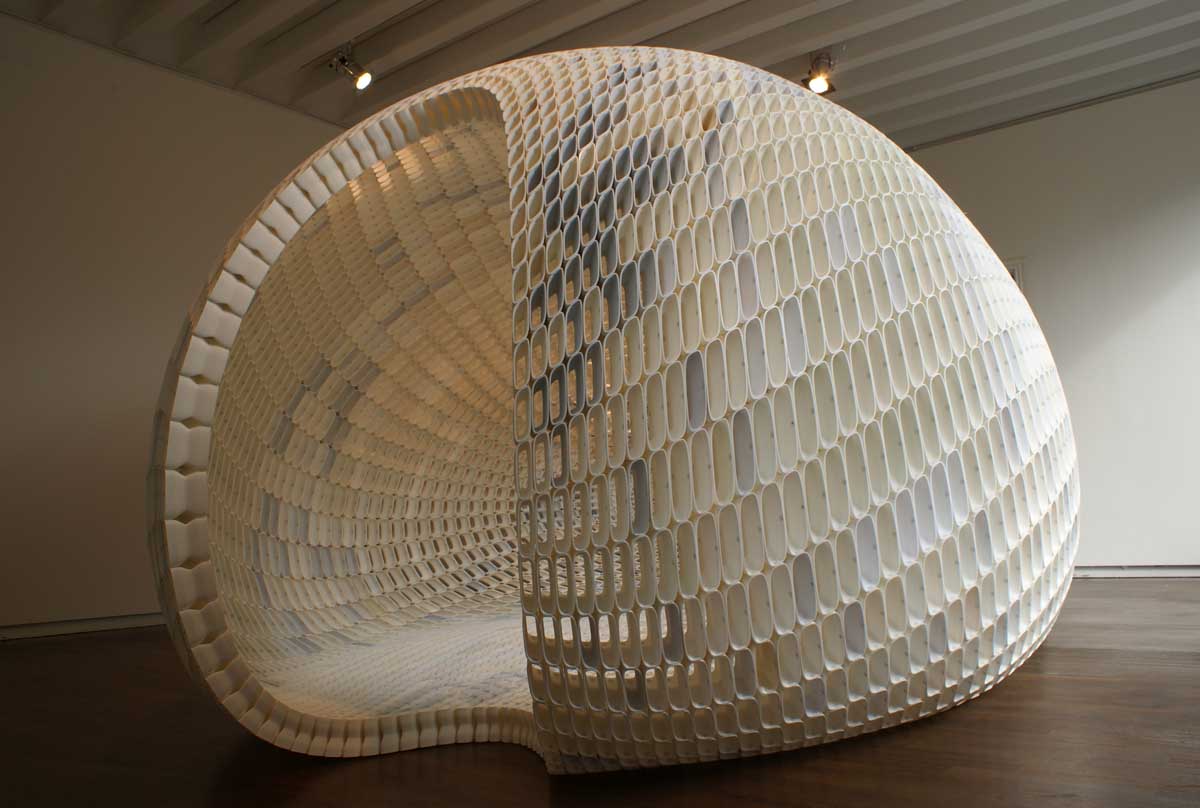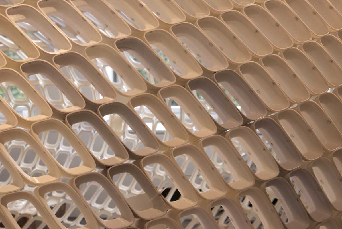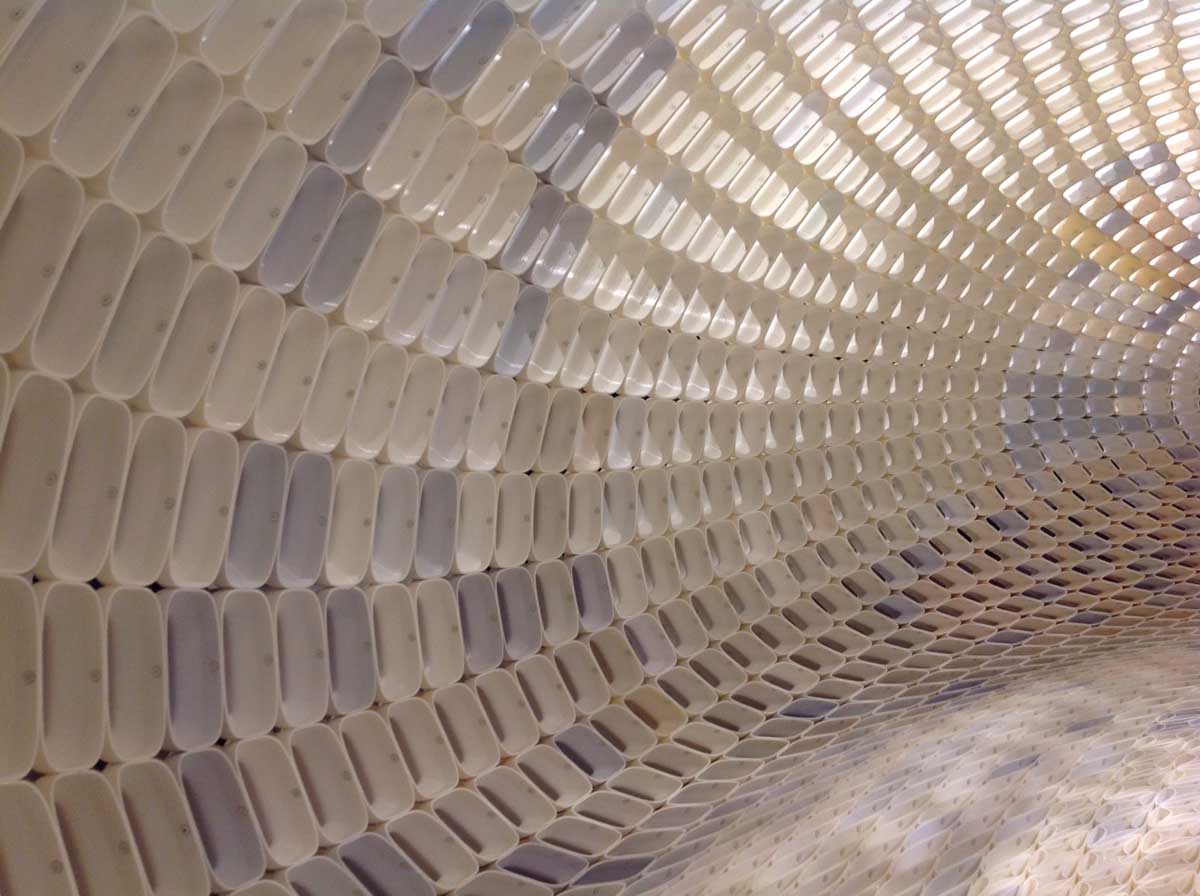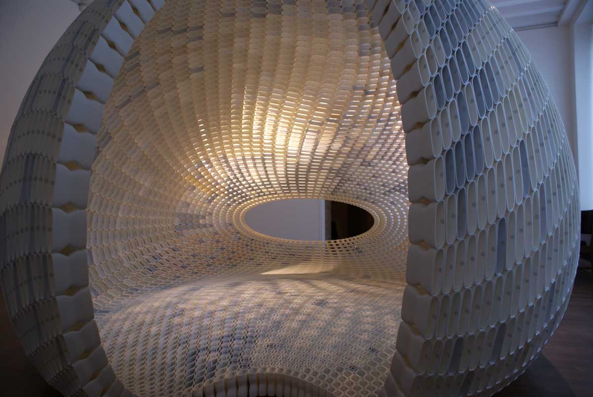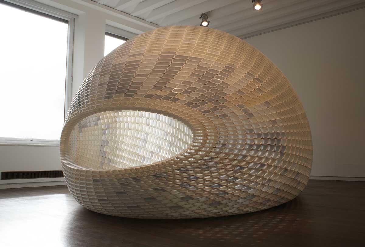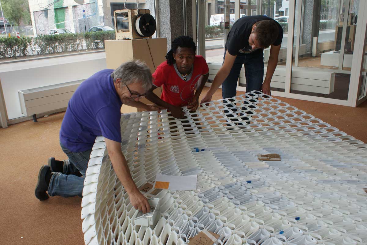It has been constructed with 4760 open, elegantly designed stones, each one’s shape unique. Many small elements together forming a large structure, as in the objects from nature that designer Michiel van der Kley likes to look at, such as crocodile skin, corn cobs, coral. He finds in these a language of segmentation which he merges with the possibilities of desktop 3D-printing; when you see a large object as the total of many small elements the potential is limitless.The material is new, PLA, re-usable and biodegradable. Also the way this object is produced is new; not by a factory but by a community.