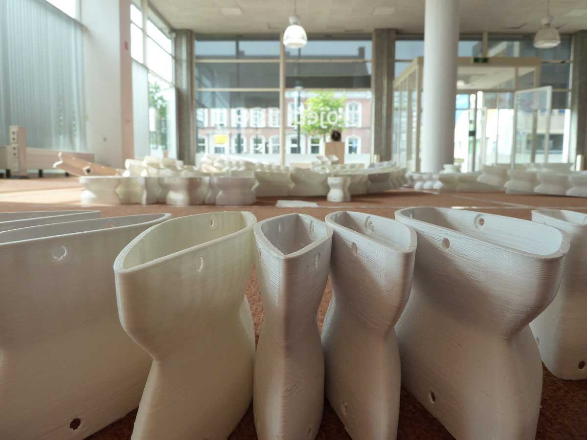 If a 3D printer is a new machine, you could be challenged to look for a new kind of shape language. Varying each and every object might be one of the aspects, the coarse surface of the objects might be one too, and of course a shape that could not be produced in a simple mold.