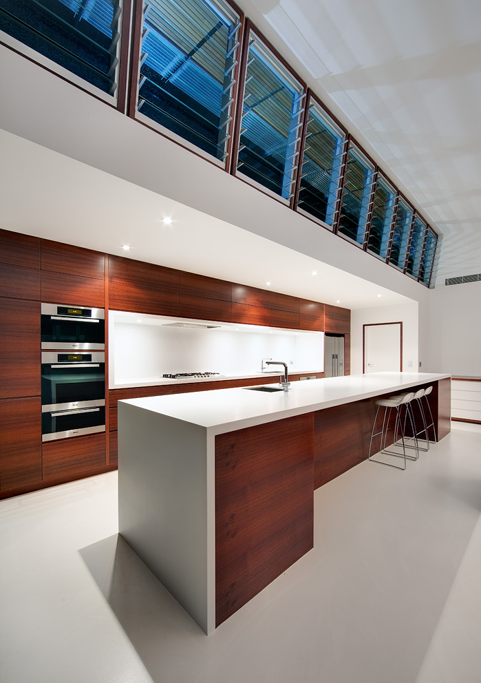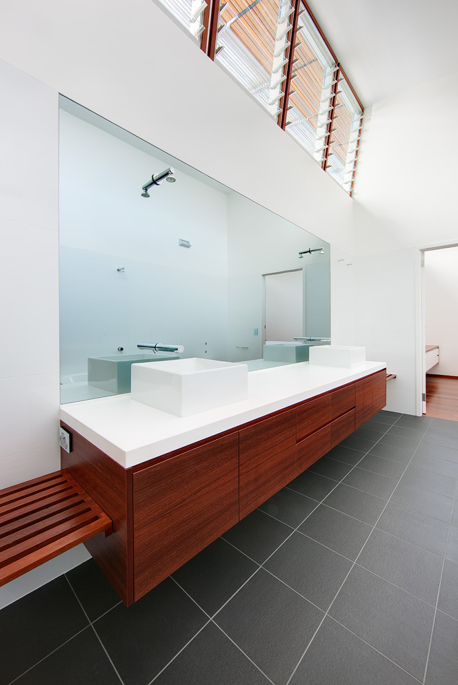 Integral to the design of the house, and carried forward from the site’s original structure, is the entry sequence, marked with a stunning custom designed recycled Jarrah door, incorporating a bespoke hand-turned Jarrah handle. Passing through this portal, the hallway extends through the house as an ordering element conceived of as a tree trunk from which the private spaces of the home branch and around which the butterfly roof form is mirrored. The unique nature of this entry sequence called for a bold gesture that denoted arrival and promoted connection, achieved with recycled Jarrah floorboards forming the mirrored floor and ceiling.