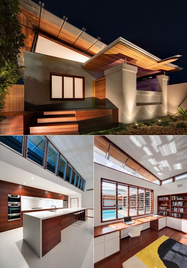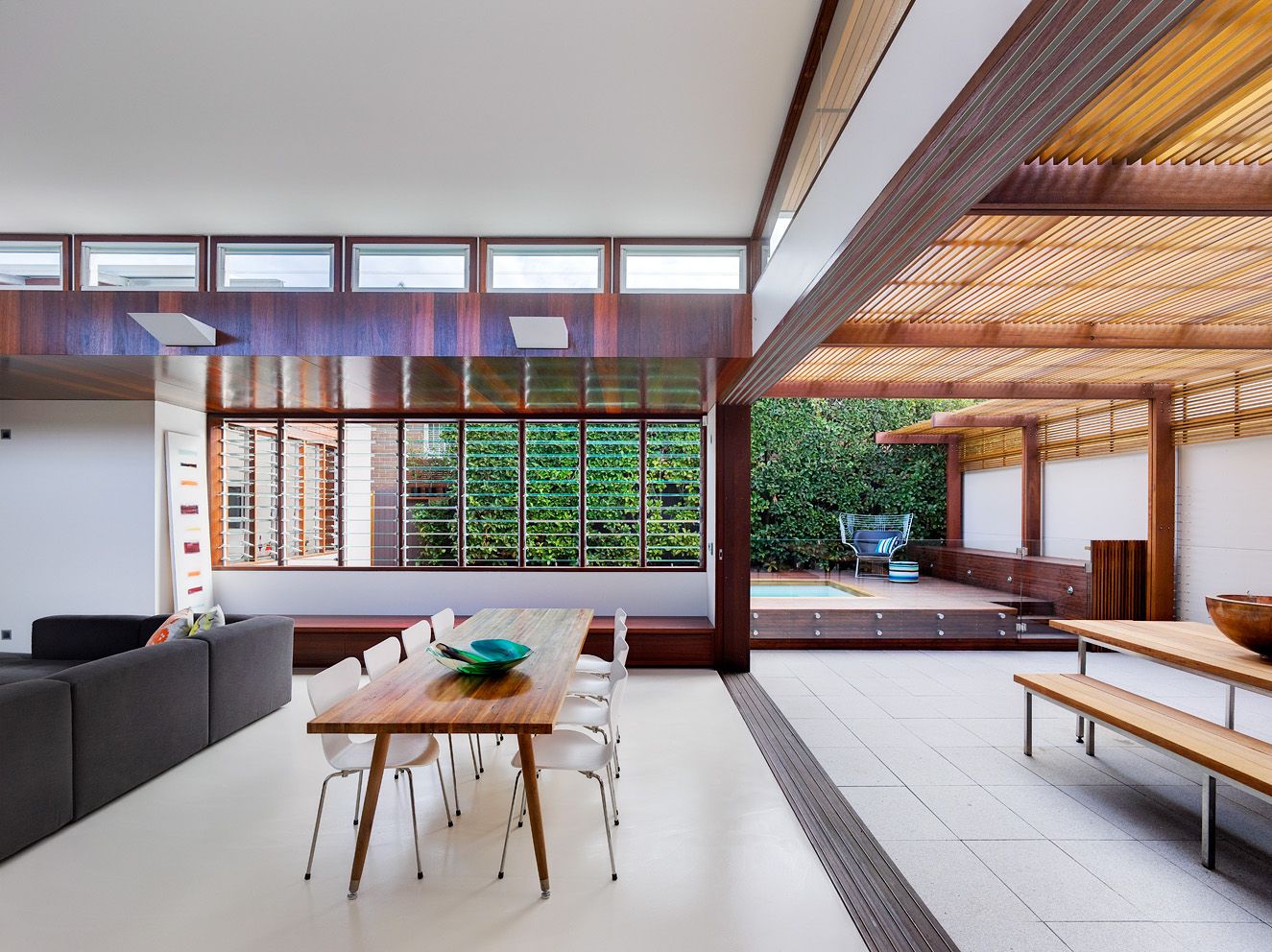 Arriving at the social heart of the home, the open-plan living spaces are surrounded by extensive cabinetry that utilises the finish and efficiency of timber veneer and the centrepiece of the home, a custom Kauri Pine table formed from the original floorboards of the home. A strong connection to an enclosed courtyard is established through the use of large windows and doors made of recycled Jarrah. Forming the threshold to the outdoors is a meticulously detailed pergola structure built of Jarrah and Western Red Cedar battens that filters the light to a fine filigree. Beneath this timber canopy sits the Blue Gum deck and pool coping of Burmese Teak.