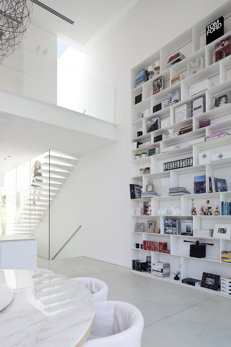 The structures two supporting side walls have been emphasized, one was poured from exposed, architectural concrete and on the other a large library reaches to its full height.