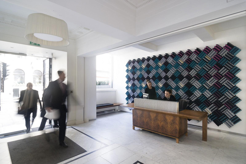 RCKa has completed Acoustitch, an art piece in the foyer of 11 Waterloo Place in St James’s, London, that was made from over 780 pieces of acoustic foam.