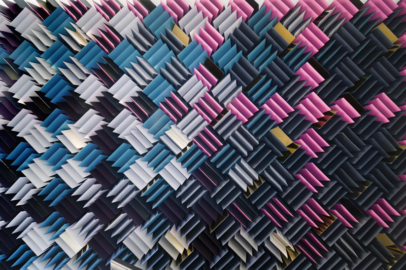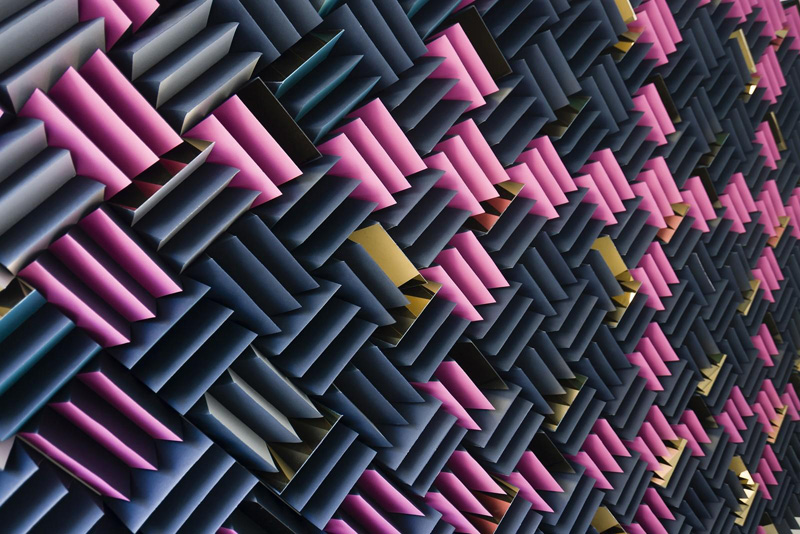RCKa worked with East London based company Cutfoam to devise a high-quality and cost effective way to fabricate the artwork, which is constructed from 789 pieces of high-density acoustic foam cut into triangular forms. The foam pieces are adhered to birch-faced ply backing sheets that fit together jigsaw like for ease of transportation and installation, and wall mounted using simple split battens.