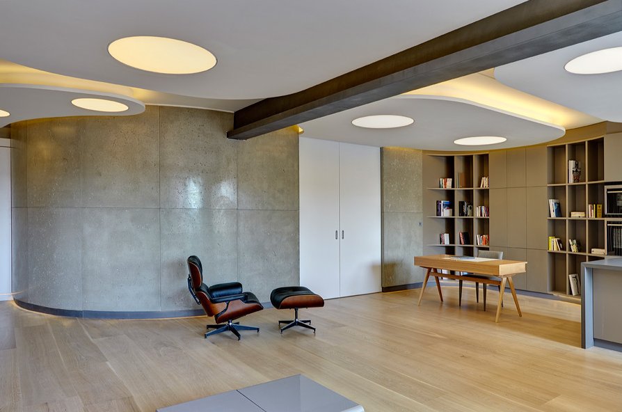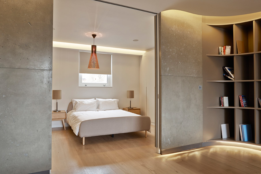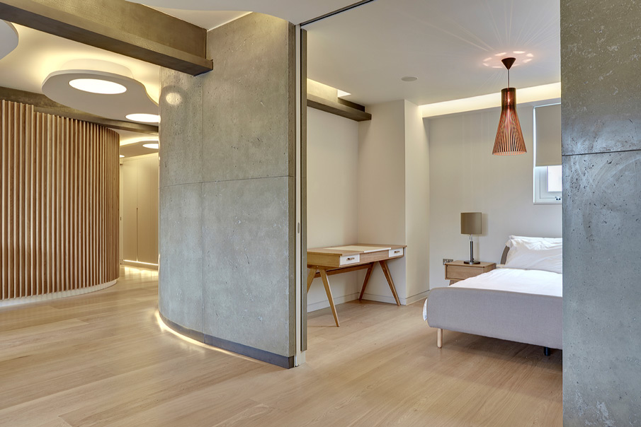 Located in the heart of Shoreditch, the Redchurch Loft is a mix of nine loft-warehouse-style apartments positioned enviably on Redchurch Street and Old Nichol Street. Studio Verve was commissioned to design the interiors of one of the largest apartments from shell in. Conceived as a swirling fluid progression of spaces enclosed by a rich yet subtle palette of materials; a series of cloud ceilings culminate onto a spacious open-plan lounge and kitchen which open out onto the terrace overlooking Redchurch Street. The sheer coldness and solidity of the bespoke pre-cast concrete wall panels contrast beautifully against the warmth of the white oak fin wall and floor cladding and the playful cloud ceilings and diffused pool of lights.