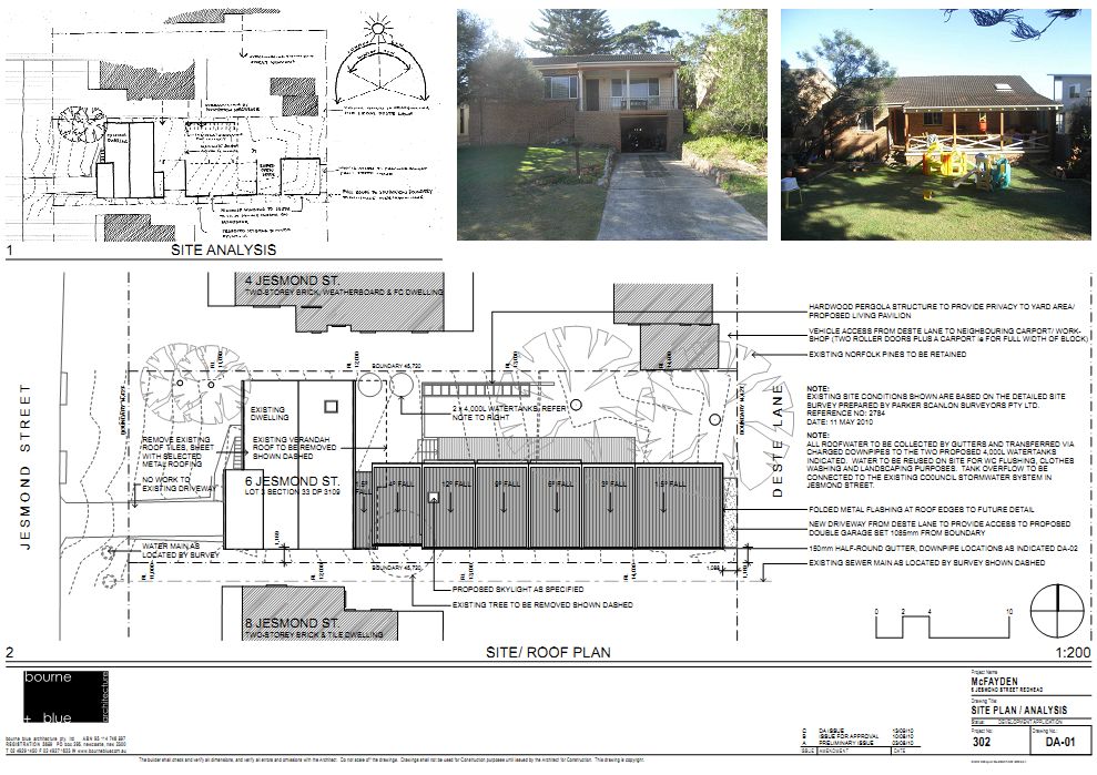 This project at the coastal village of Redhead (near Newcastle, NSW Australia) was on a large suburban block, that runs East to West, gently sloping to the rear. A small seventies project home existed on the site, orientated North – South, with poor environmental performance and minimal connection to the substantial yard. Towards the rear of the yard in the North-East corner are two large Norfolk Island pine trees.