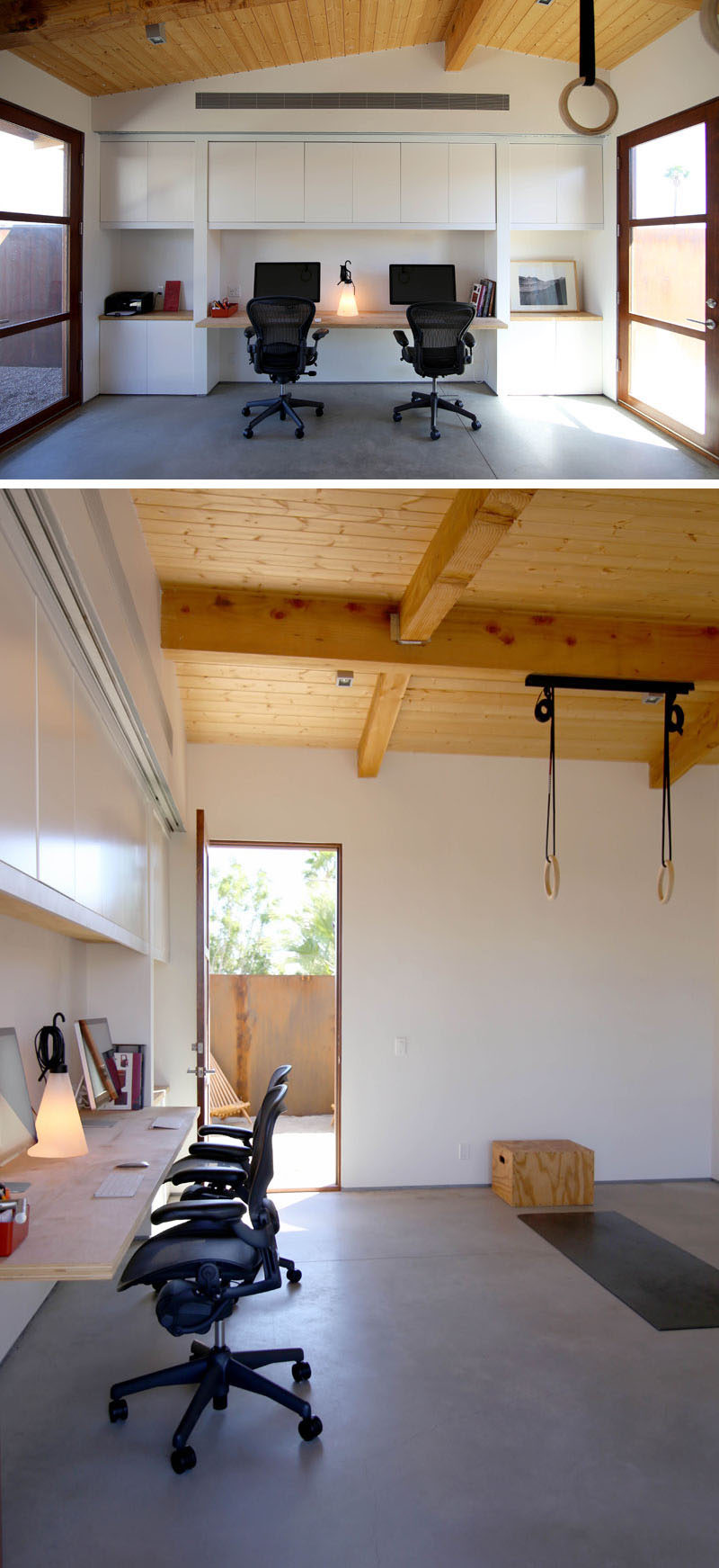 Next to the guest bedroom is the studio / home office that also doubles as a gym. Wood framed glass doors open up to the patio off the guest bedroom on the right and the front courtyard on the left.