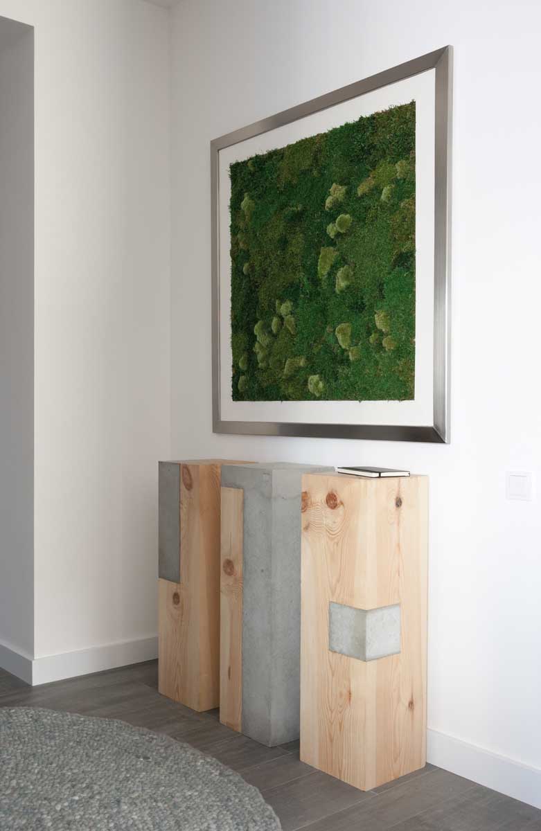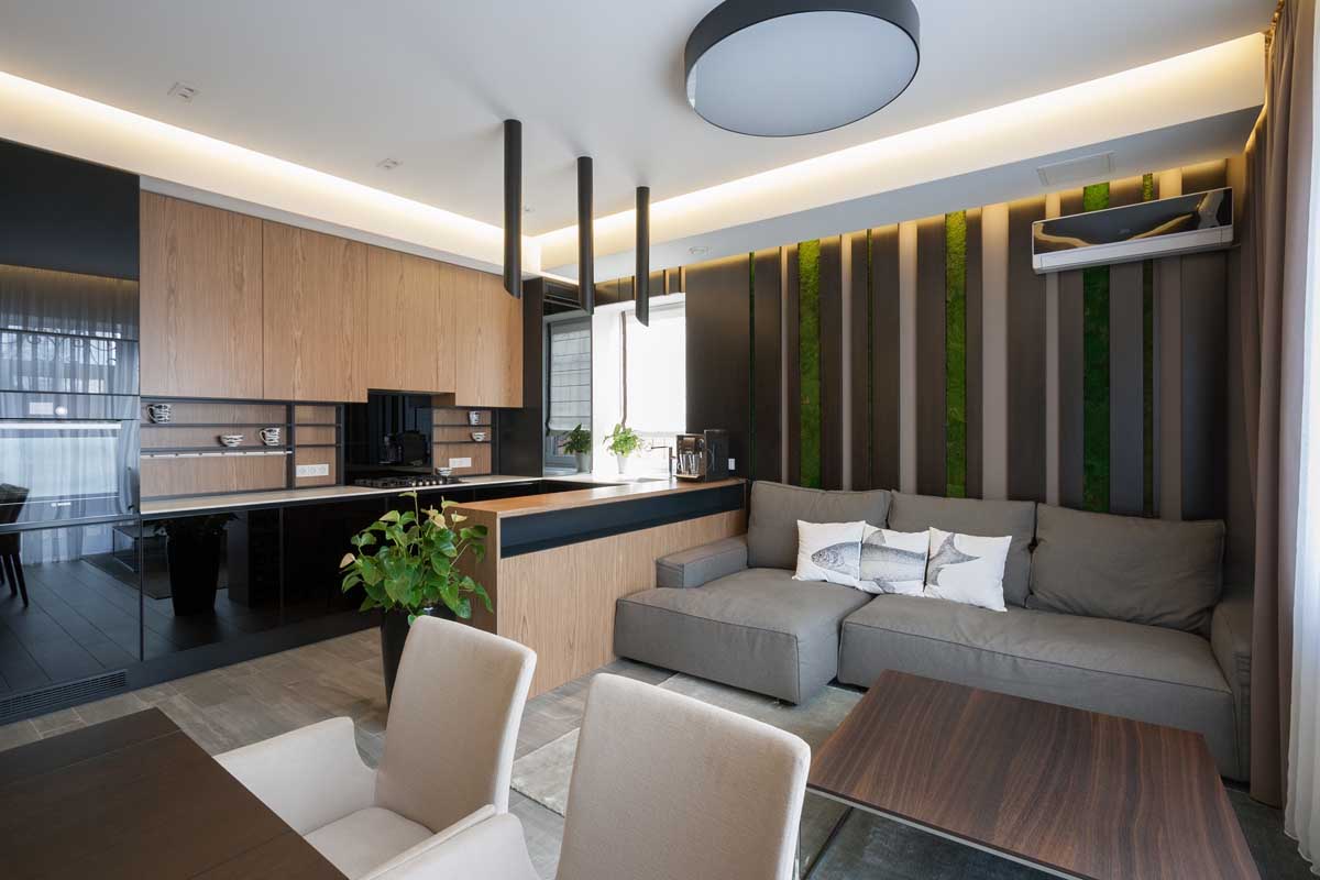 The main idea was based on the combination and the interaction of color, material and texture contrasts. Black gloss kitchen and a moss panel, bright polished marble and dark matte wood, prominency and perfect smoothness are harmonized with eco-design elements.