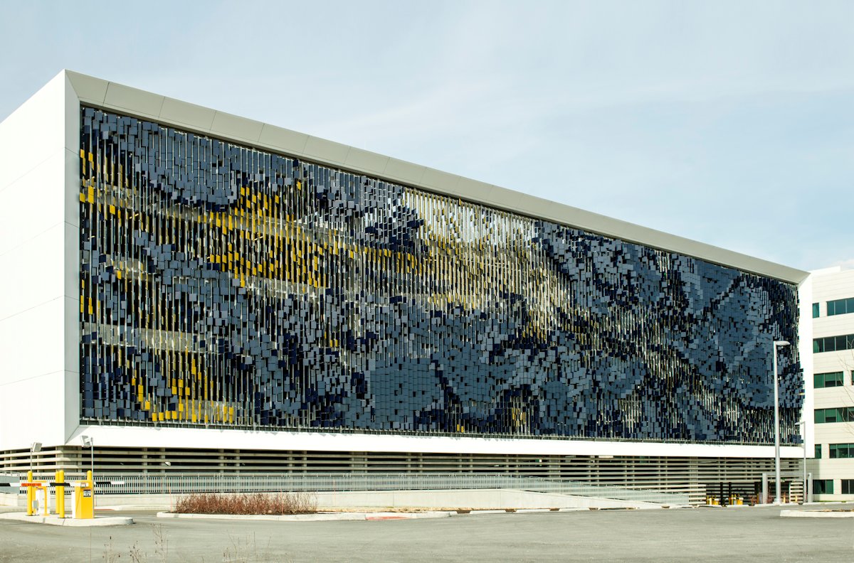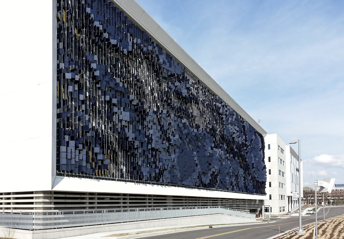 Rob Ley of Urbana Studio has recently completed May-September, an interactive art facade made from 7,000 angled metal panels attached to a parking structure at the new Eskenazi Hospital in Indianapolis, Indiana.