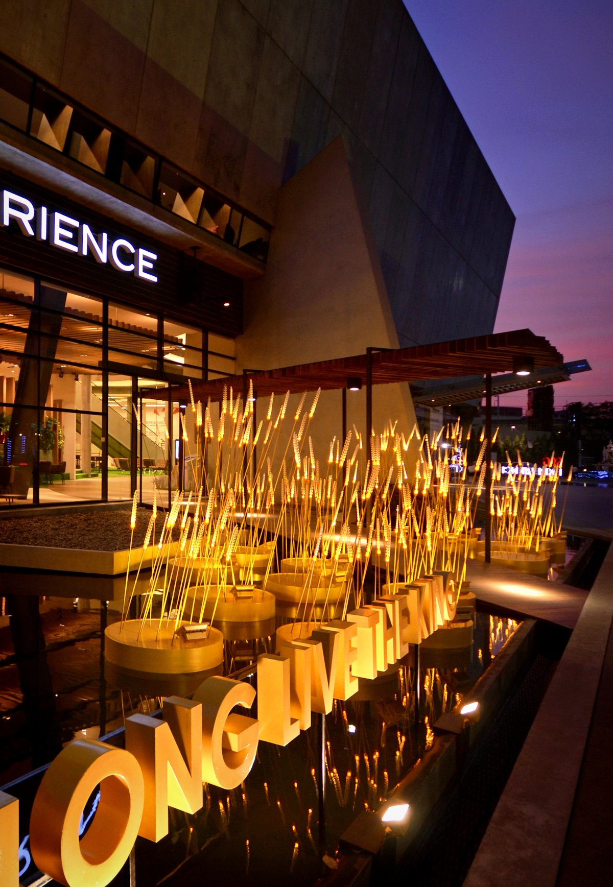 The lighting installation ‘Royal rice field’ is a new approaching to the main entrance of ‘SCG experience’ building as well as to exhibit and honor the intelligence of His Majesty the King Bhumibol particularly in Agriculture due to the best occasion to cerebrated His Majesty the King’s birthday in 5 December. It is represented by a grove of ‘light spike’ among the water mean the abundant of Thailand and also ‘gold’ is represented the brightness of His Majesty thought in agricultural which is the fundamental of Thai economics.