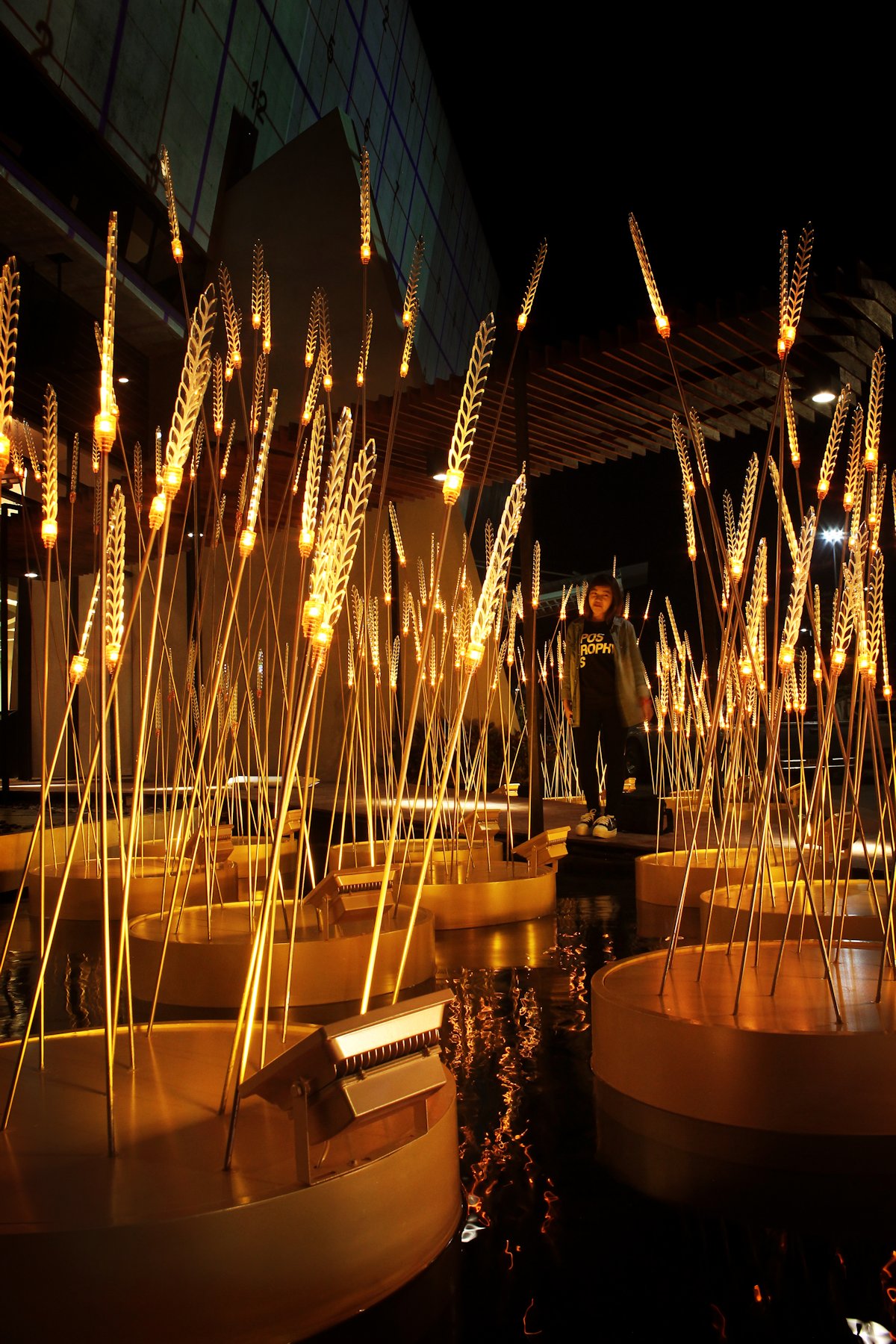 ‘Royal rice field’ has been experimented for the best aesthetic form, suitable light bulb specification, material and also its composition. Finally, it is composed of 300 golden-yellow LED light bulbs, enclosed with rice spike shaped transparent acrylic sheet on the top of its golden stem which is made from steel tube inserted with LED wire inside. To imitate the characteristic of nature, each figure has been adjusted its height and composition randomly into 15 circular platform islands with an underwater electrical wiring system enhance with waterproof lighting to flood all the field and CNC plywood text ‘Long live the king’ with static golden light. Thus, their metallic gold is brilliant and stunning in the sunshine but dramatic glow at night as well as the reflection from the pool is created the glare dazzling onto the water surface for all time.