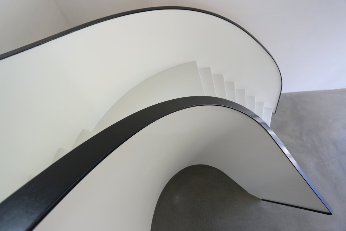 The free flowing shape of the staircase could be considered a careful architectural representation of the water that Sanibell products are designed to deal with on a daily basis. The EeSoffit finish on the stairs means that this superb feature will not deteriorate in the way that plaster finishes can ensuring it will continue to look flawless. Ros said, “Working with a specialist such as EeStairs means that expert support is available at every stage of the project, from concept, to visualisation and completion and end users benefit from cutting edge design and materials.”