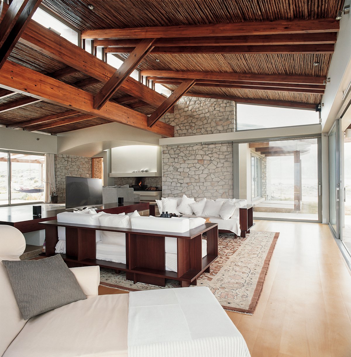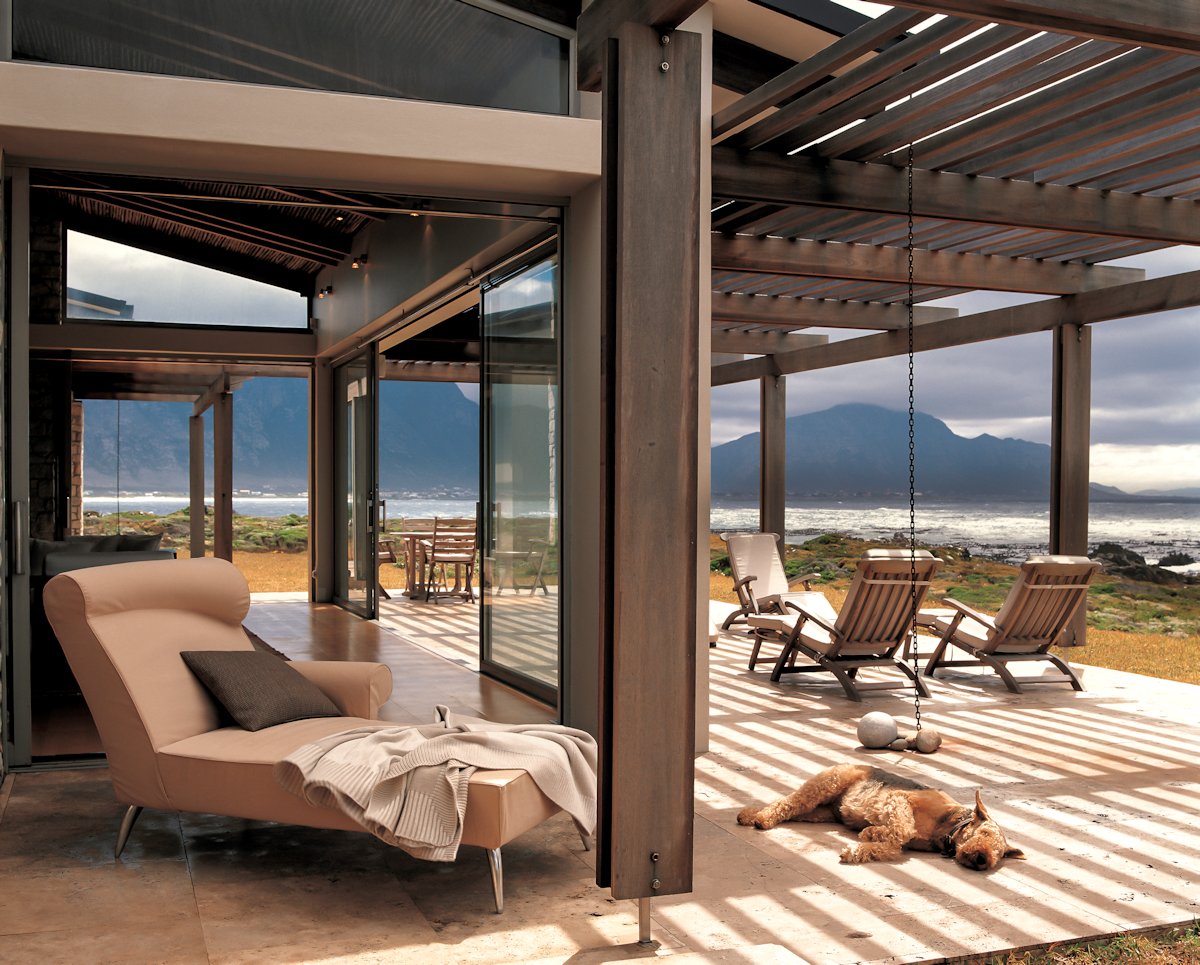 Drawing inspiration from local architect the result is a linear homestead with large verandas and monopitched roofs. In contrast, natural colours and materials were used, using warm sandstone, ash-grey Balau woodwork and a charcoal metal roof. The location of the site permitted large glazed areas and extensive use of outdoor spaces, with each aspect of the house having a private terrace or deck. The contrast between solid stonewall panels, large openings and the delicate infill roofing gives the house a sculptured feel. The open plan linear composition of the interior spaces allows views from every room. To take advantage of the sea and surroundings, Hangklip Mountain views and to provide protection from the extreme Cape Coastal climate, the living spaces were designed with north-south orientations, resulting in an open flowing space with sea and mountain terraces. This allows the house to live on both sides with the main living spaces forming the link between inside and outside. The orientation gives the owners the option of entertaining on the mountain/dining terrace side during poor weather conditions and on the living/sea terrace side on sunny days. The through-views also ensure that one always experiences the beauty of the sea and mountain.Materials used