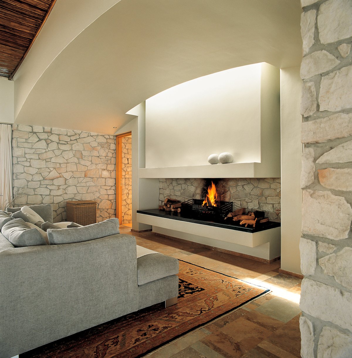 The dining room which is the focus of the family’s activities is flanked on either side by deep sculptured “contained elements”, clad in the sandstone finish. These arched chambers function as the kitchen and fireplace alcoves. Concealed skylights at either end bring light into these spaces and there is the constant play of shadows and filtered light. The living room is located on a split level with a high ceiling and clerestory windows. Heavy timber roof rafters have been exposed in these areas and the ceiling has been finished with “latte”, a material traditionally used in the construction of thatched roofs. The ceiling texture is soft and natural. Clerestory windows open to improve air circulation on hot days, and provide ventilation when bad weather does not permit the use of the large glazed openings. Two showers are provided by timber screens constructed of “latte”. A guest bedroom and garage / utility room are located on the mountain side.The key to this holiday home is its simplicity in terms of the relationship between spaces. Its floor plan is structured, sparse and uncluttered.