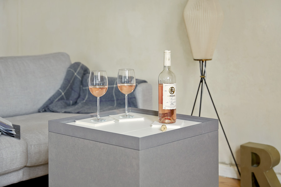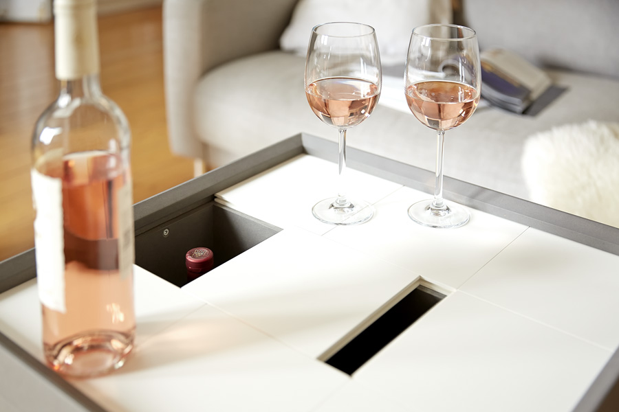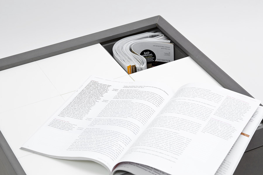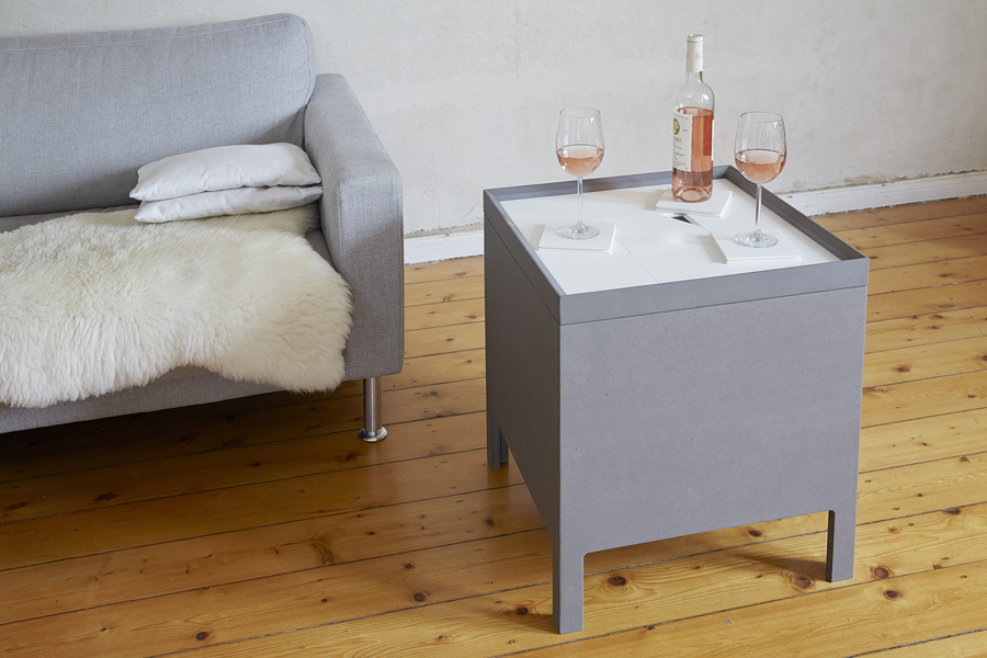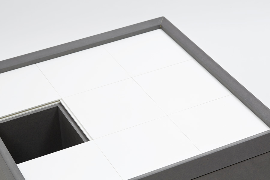Inspired by a childrens toy we designed the side table “Schiebepuzzle”. The front doors can slide up and down and from side to side showing just a little bit of his content at a time, the rest is a seeking-game – for magazines and the minibar, for bottles, glasses, coasters or a deck of cards. Decent and lightly in impression this side table fits in lounges, lofts, living rooms and everywhere, where small things need a place.