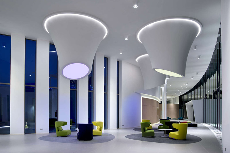 Alcatel Lucent chose DEGW Italia to design a vibrant and energetic environment for its new office in Italy. One interesting feature that was created, were these sculptural light-filled cones that descend from the ceiling.