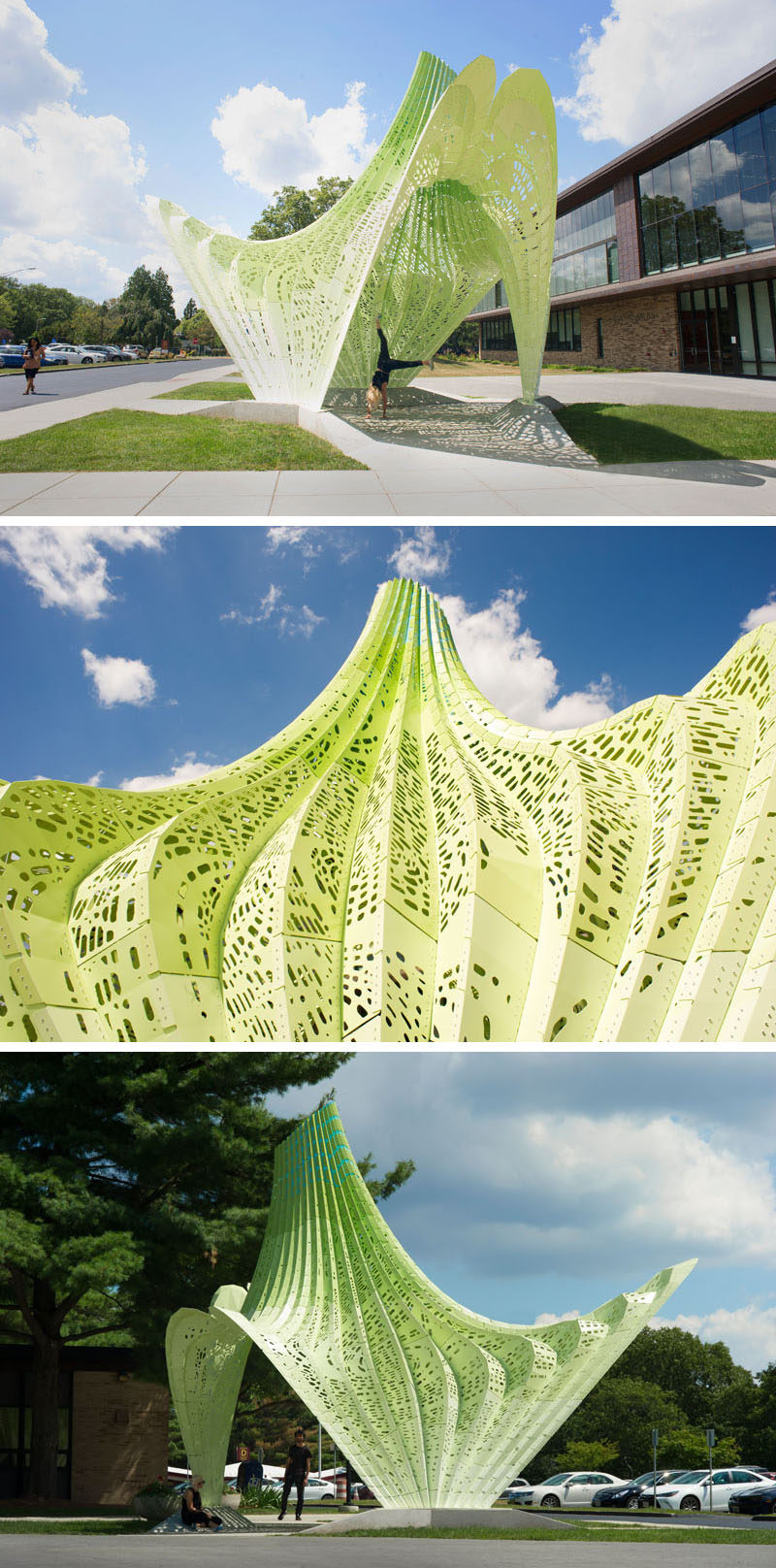 The collection of green curves that make up the sculpture, entice visitors to the college to wander into the sculpture that has a height of 22 feet.