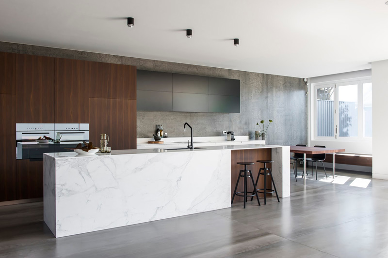 The open plan living space combines the kitchen and dining areas, which display both warmth and sleek aesthetics.