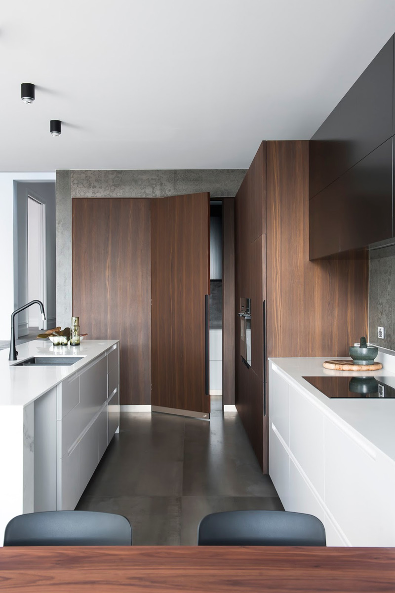 One of the requirements of the home owner was to have the laundry included in the kitchen’s design. To solve this, a door that simply appears to be just another cabinet door, hides discreetly in plain site.