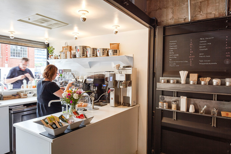 Inside the small 330 square foot space, is a small walk-up espresso bar and seating, where everything has a touch of industrial style.