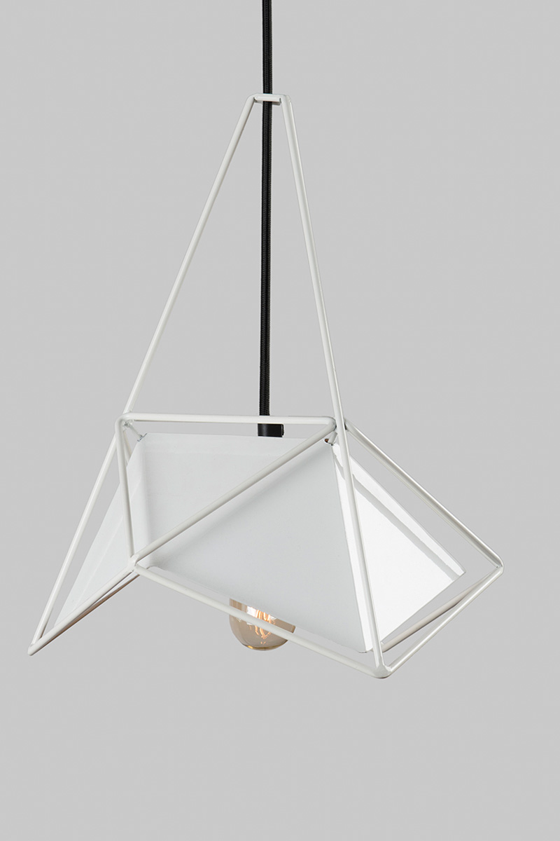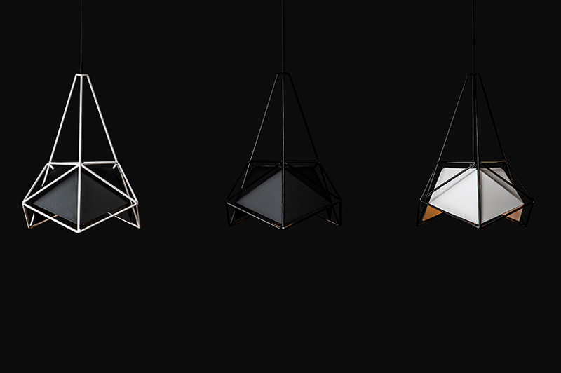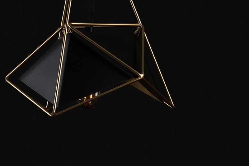 Composed from two icosahedric geometries the lamp presents a distinct angular dialogue, between surface and frame.