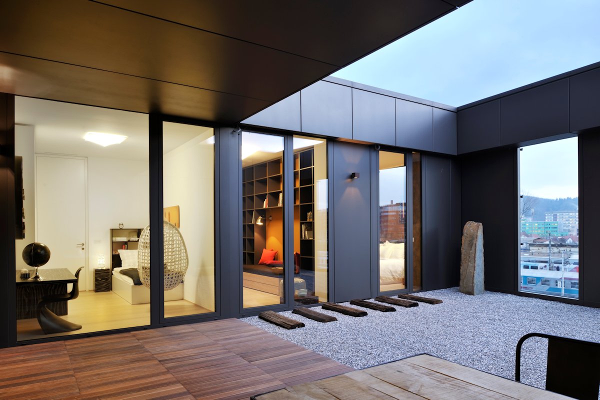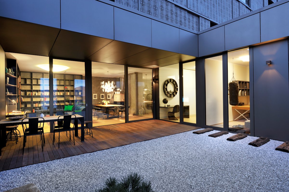 The space is therefore divided by the pier and so the living-dining room opens up to a beautiful atrium which was inspired by the Japanese gardens, but upgraded by incorporating some old wooden railway tracks as a sort of platform used for passing the garden and it’s fragile pebble decoration.
