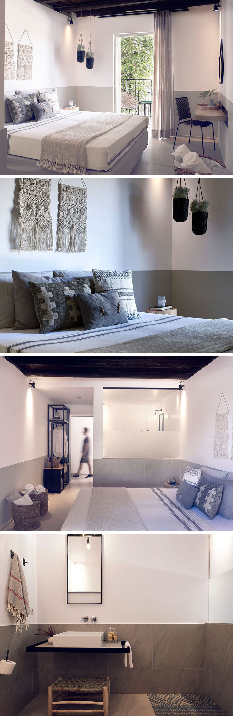 All of the hotel rooms feature white walls with grey strips along the bottom half and have been decorated with pieces like wall weavings, plates, and decorative floor tiles that all bring in some of the traditional Greek culture and add touches of uniqueness to each room.