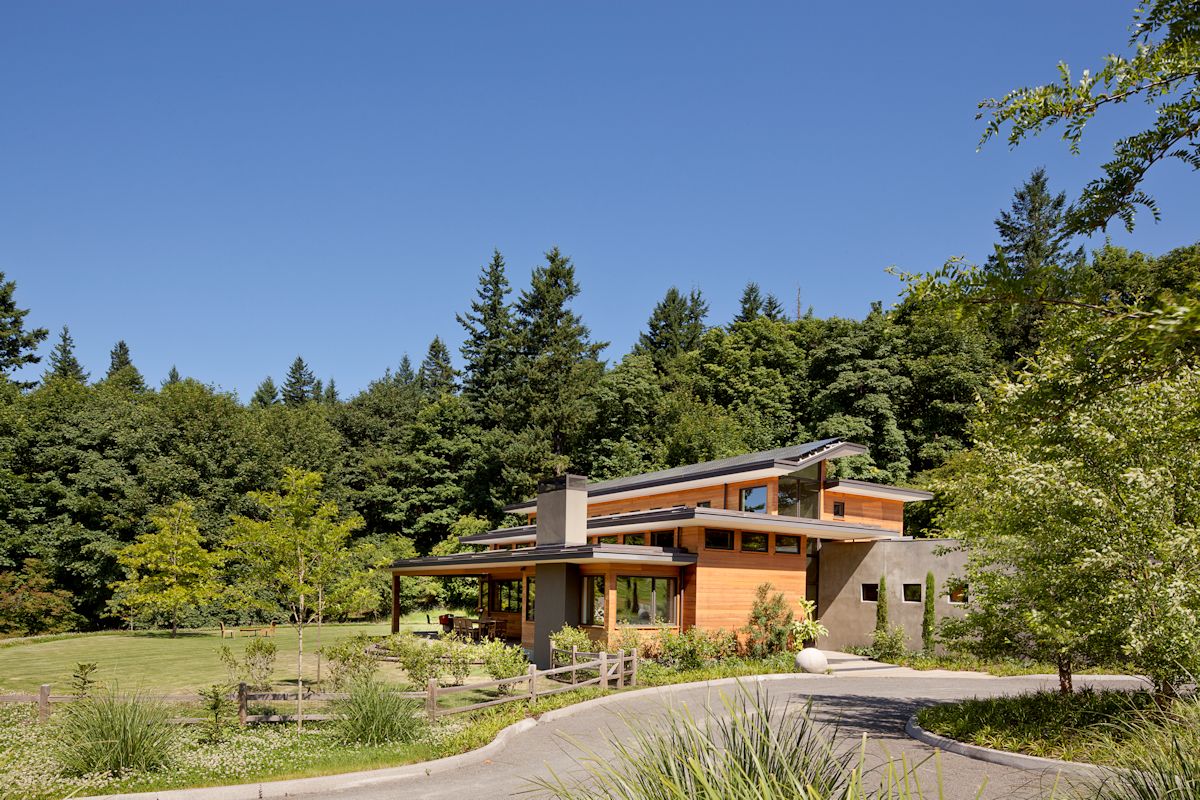 The 1.7 acre site is relatively level and within a mile of downtown Portland. The home was positioned at the far north side of the lot to reduce the impact of noise from the Skyline Boulevard, optimize the daylighting of the sun’s path, and facilitate views from the interior of the home to the yard.