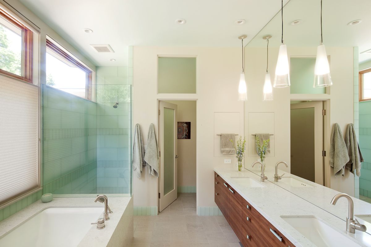Most of the materials for the home came from within a 500-mile radius. All of the stone, composite counters and tile were produced and shipped from the US. The only know materials that were imported from outside the US include the heating and ventilation equipment, various electrical components, many of the lighting fixtures, and most of the appliances. Some of the materials used in the construction of the home were salvaged from the previous home: timber beams, concrete foundations pulverized for road base, and 2x-framing lumber. All of the remaining wood framing for the home is FSC-certified. The FSC-certified madrone flooring was locally sourced.