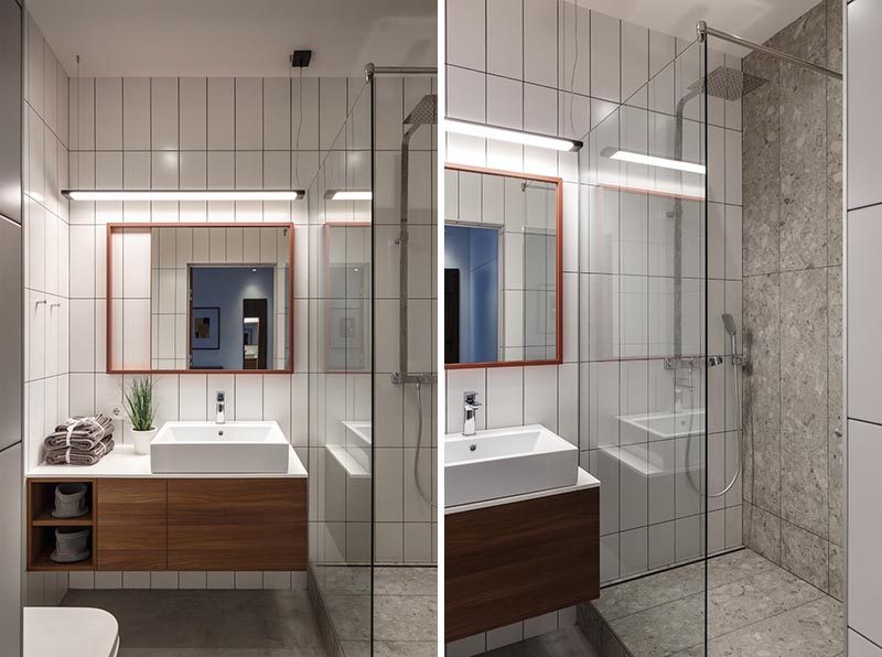 By the front door, there’s a hidden door located within the wood accent wall, that opens to reveal the bathroom. Floor-to-ceiling rectangular tiles in a vertical arrangement cover the walls, while a wood vanity with a white countertop fits neatly beside the shower that’s separated by a glass screen.