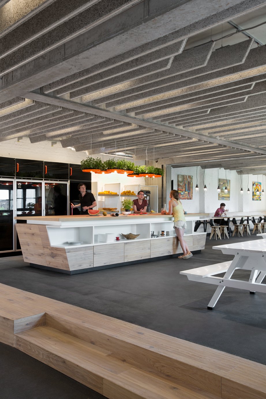 A vital and oft-neglected aspect of any space, due to its functional, work-related and identity-defining significance, sound naturally takes pride of place in all SoundCloud-related considerations. Here, KINZO once again experiments with further and playful uses to make the most of acoustic materials beyond their sound-optimising properties. Imbued with new life and meaning, they might resurface as cladding for the specially designed drop lights (“Krautleuchten”) or as abstracted sound waves and light diffusors nesting underneath the ceilings of shared spaces. After all, KINZO likes to give all material dual starring roles.
