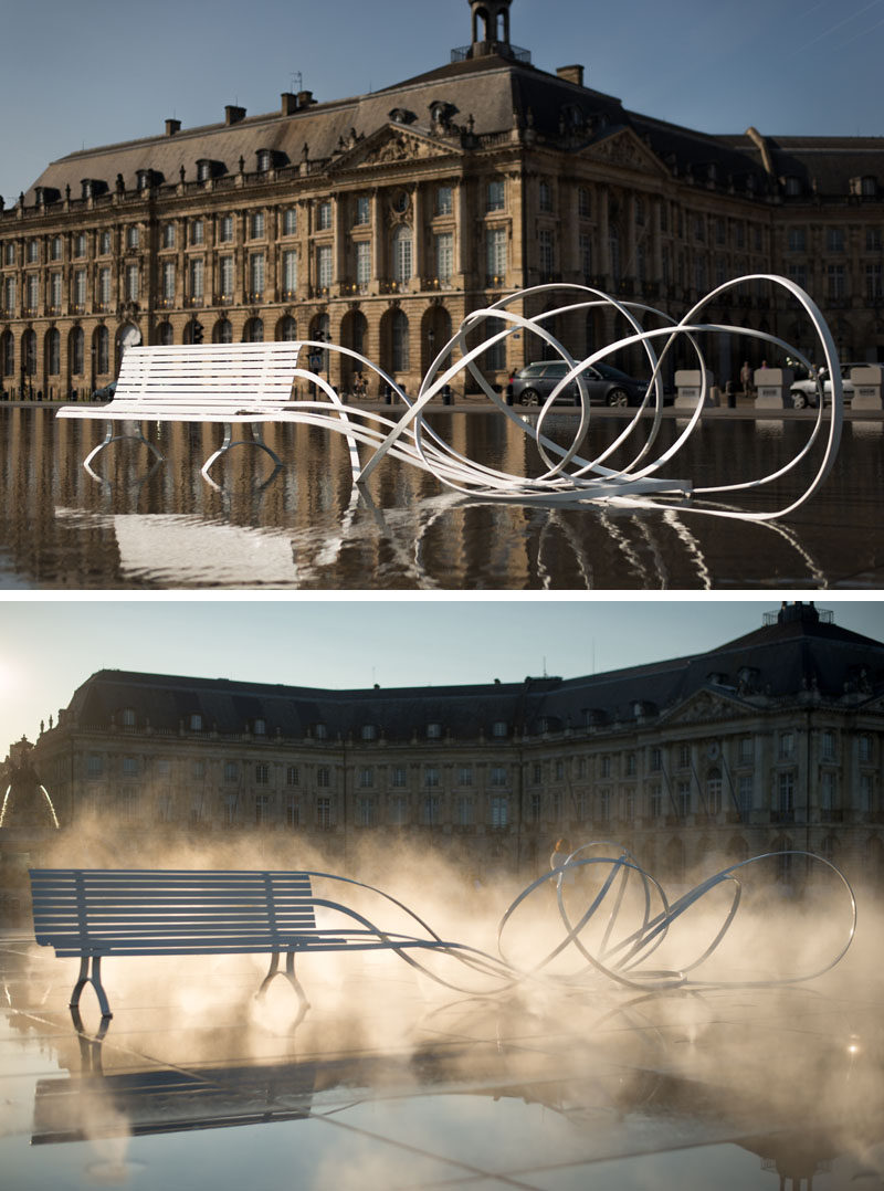 By installing the benches on the Miroir d’Eau, the water allows the physical landmarks to be turned on their heads, creating interesting reflections on the ground for people to enjoy.