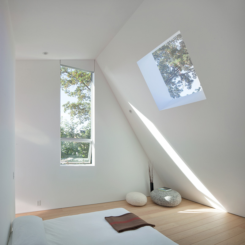 The house is designed with a dominant asymmetrical geometry to comply with the prescriptive zoning requirements for the area, while also providing space for the tall, main stair volume that rises 26 feet from floor to the peak of the ceiling. Skylights above are sized and located to avoid views to either neighbor and allow natural light to penetrate deep into the northern part of the house. Windows on this side face the street and are decidedly small to ensure privacy. A low window, at the widened main floor stair landing, is carefully calibrated so one sitting in the adjoining library can gain discreet views out.
