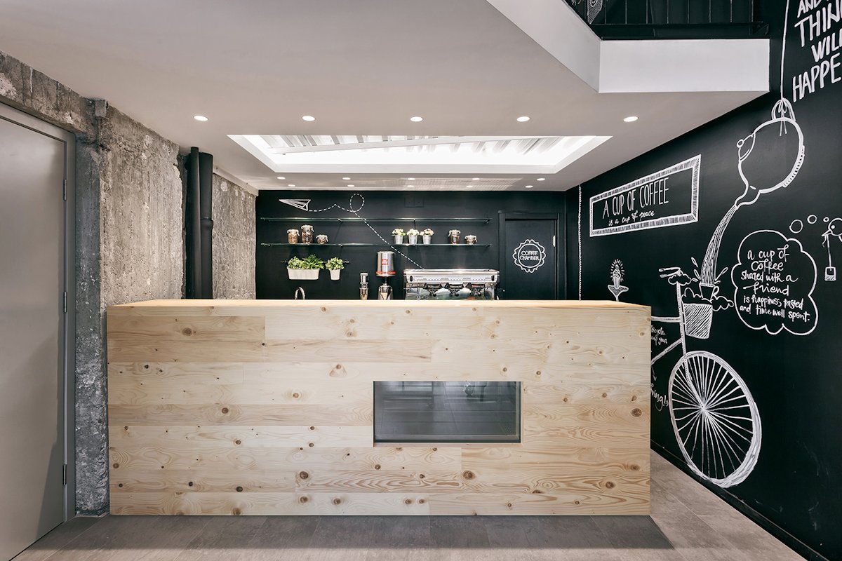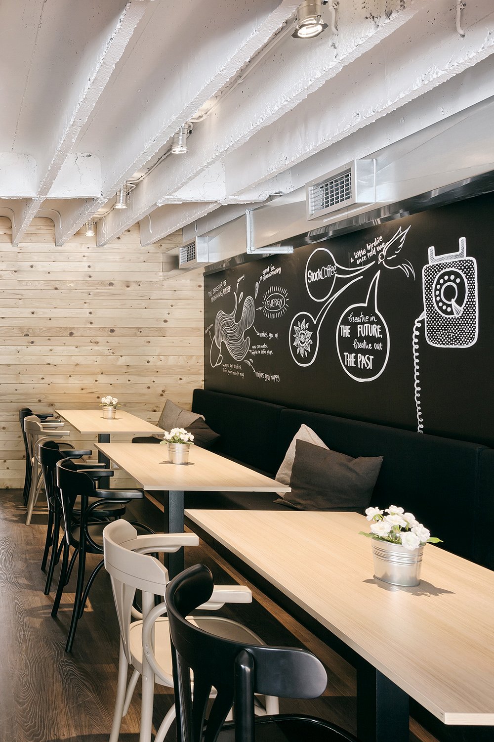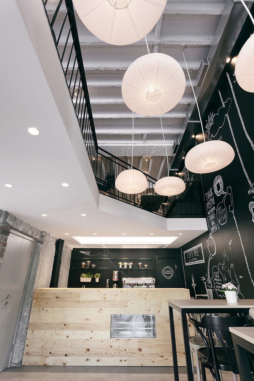Coffee shop consists of two L-shaped spaces, one above the other, connected visually and spatially by an atrium. A large wall, 10 meters long and 5 meters high, stretches through the whole coffee shop and is used as a blackboard: its hand-drawn decorations are made by the young Serbian artist Jelena Ilic. This concept of wall art is the result of collaboration between the design studio and the artist.
