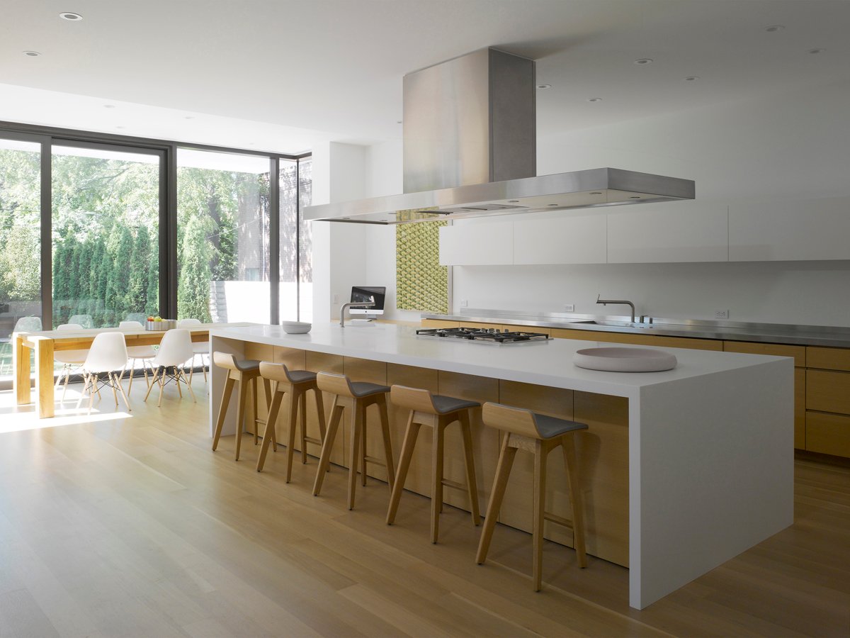 The ground floor consists of a double-height entry foyer with a floating oak stair and sky-light above, open-concept dining, living, kitchen and breakfast areas. A large mud room , walk-in pantry and powder room are concealed behind perimeter walls to maximize the openness of the main space. The second floor incorporates four bedrooms with walk in closets, three bathrooms, a study and a corridor overlooking the entry foyer below.