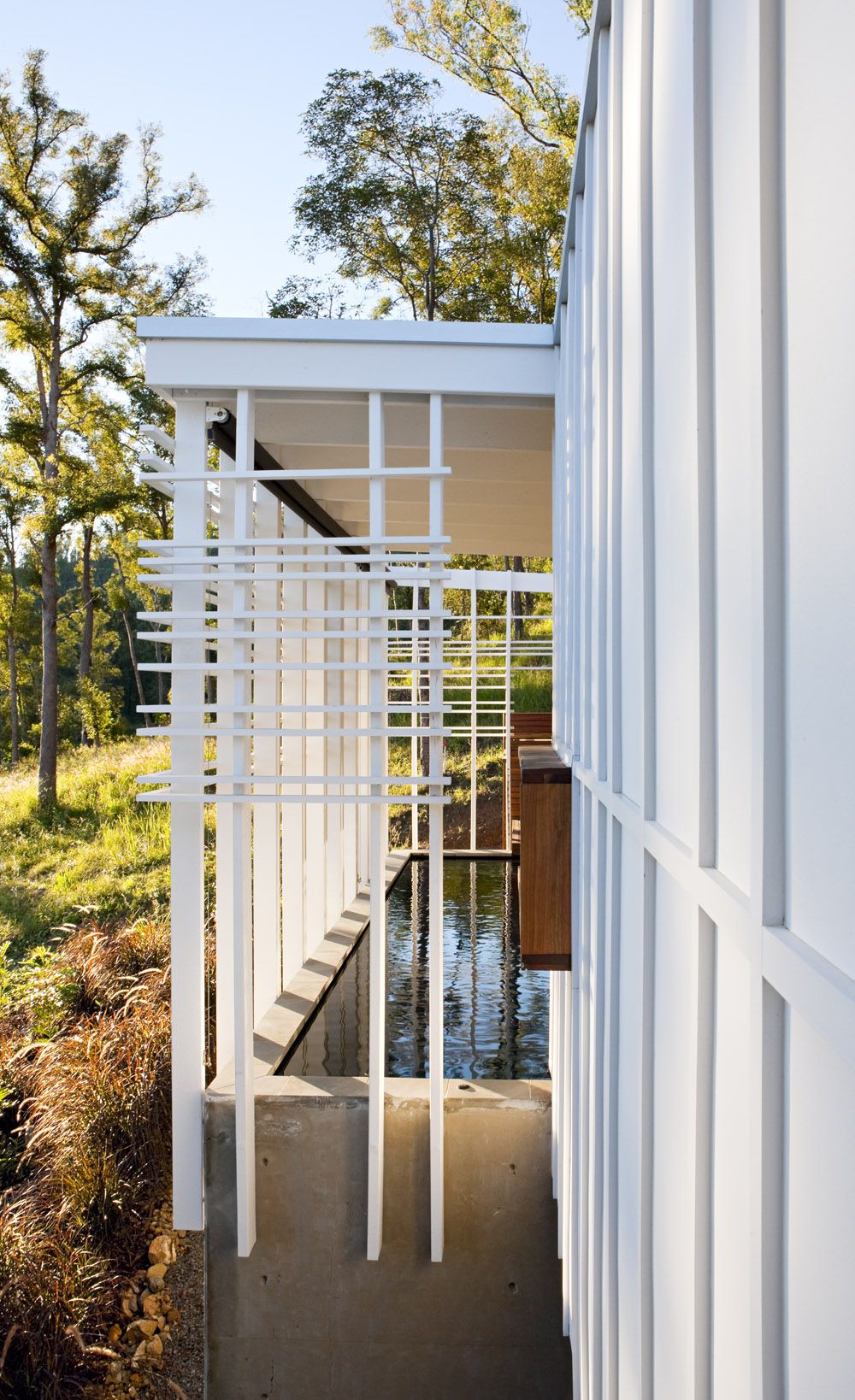 Lot 16 is wedged into the side of a hill and nestled into a large parcel of heavily wooded environmentally protected land. This charred box protrudes horizontally like fallen lumber. Solidly grounded into the site, the body of the house wraps itself around an ‘out of ground off form concrete pool’ that also reflects the charred timber in its internal finish.