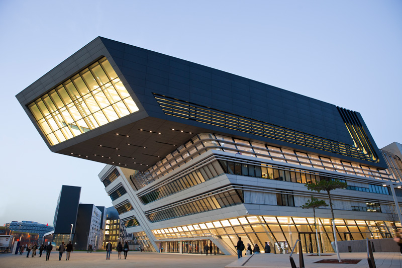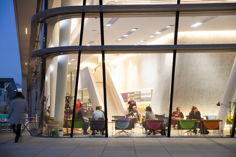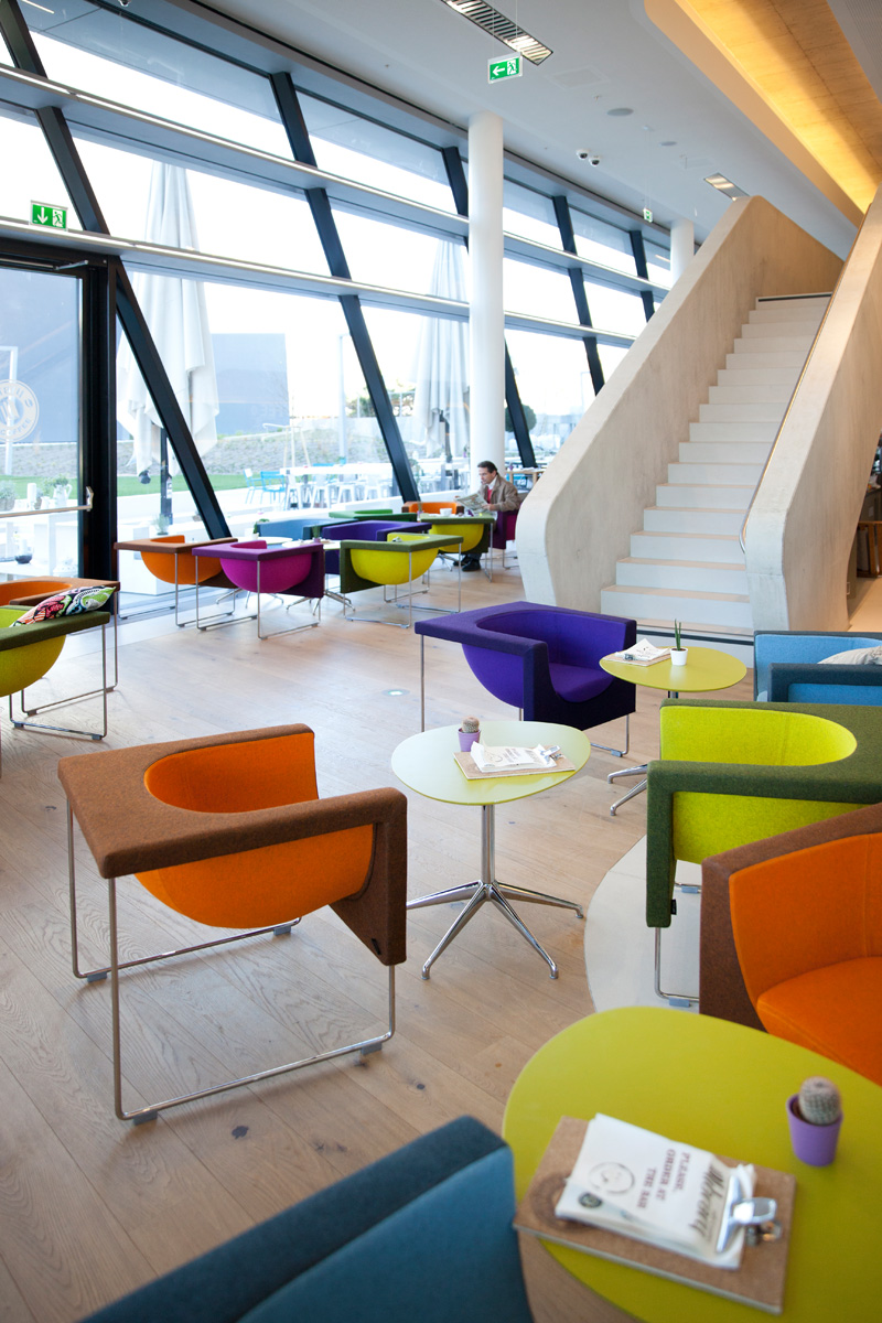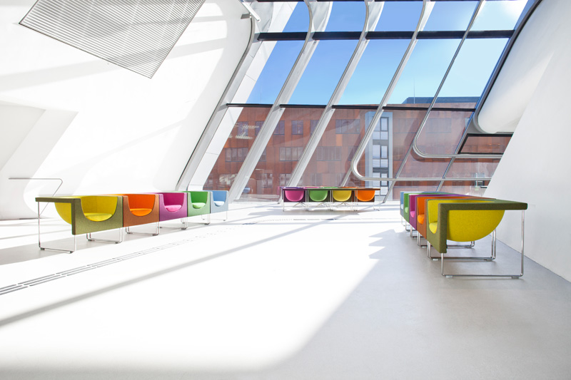 STUA have furnished the Learning Center and the Central Café of The Vienna University of Economics and Business, designed by Zaha Hadid, with their Nube armchairs and Marea tables, that make the spaces more vibrant and add a pop of color.