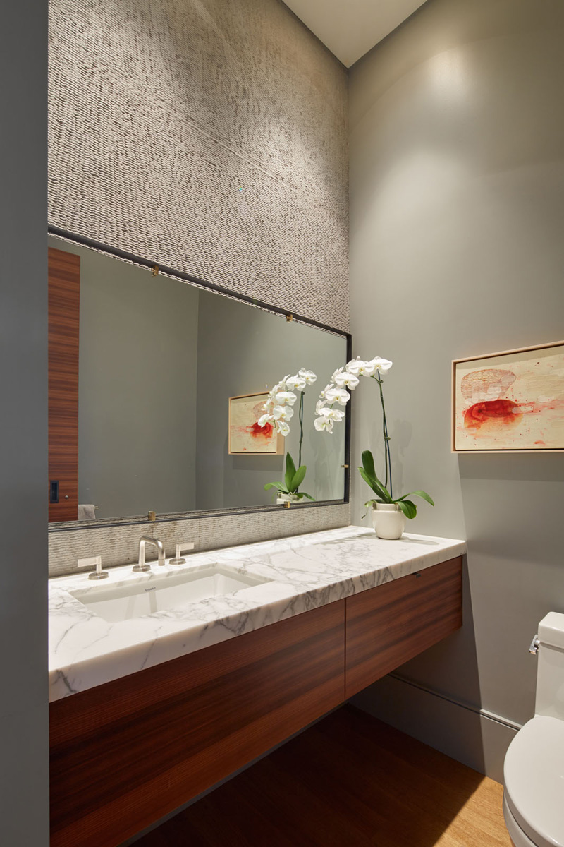 The main level is divided into large open spaces for the living areas and kitchen, which are interwoven with discrete masses: fireplace, powder room, and pantry.