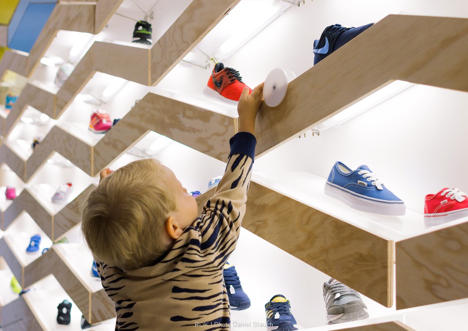 The Suppakids Sneaker Boutique in Stuttgart, Germany is home to a fine collection of kids footwear for boys and girls from baby to pre-teenagers. The unique display arrangement invites kids to play with a subtly integrated cascading disk run while browsing through the shoes on display. Similar to a marble run the edge of the display shelving serves as a guide for several colored wooden disks to play with. Although this playful idea is the key aspect of the design, it does not visually become the focus of attention. In contrast, the sneakers take center stage in a clean and flexible display and store design that was developed with customers of various age groups in mind. The client’s need for flexibility of both, the display area and its arrangement, was addressed by a custom-made wall display system. Thus, CNC-bent steel rods and clip fasteners for quick and easy reconfiguration of the 96 wooden panels have been used. The backlit counter and display elements are made from natural and painted pinewood creating a warm and inviting interior.