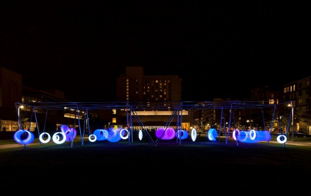 Höweler + Yoon Architecture have created an interactive playscape composed of 20 illuminated ring-shaped swings. The installation is located at The Lawn on D in Boston, Massachusetts and will be on display until October 31st.