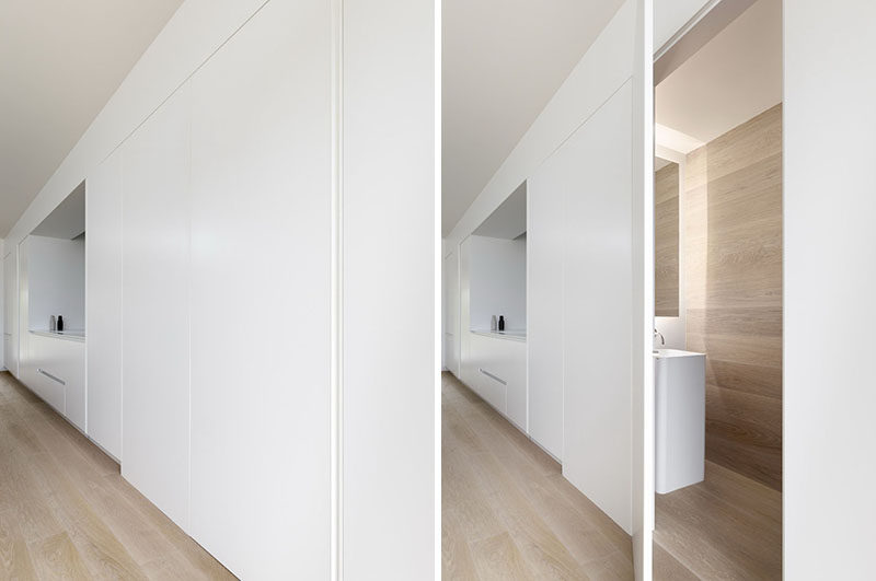 The streamlined minimalist white kitchen cabinets line the wall, and hidden behind one door is a powder room.