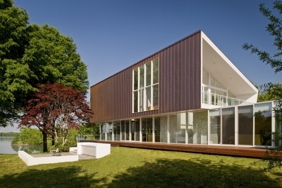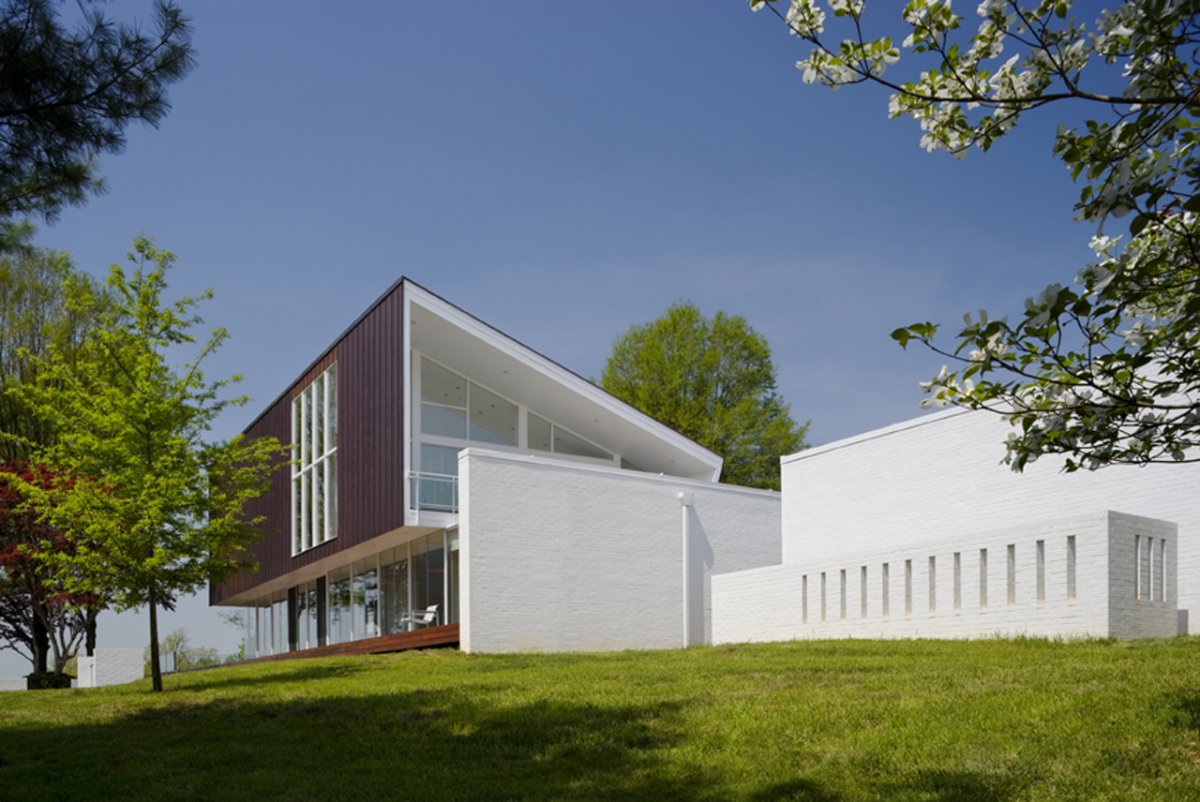 The journey down a winding road and through a pine tree forest ends at the Buisson Residence. Situated on a grass knoll and commanding views of Lake Anna in Central Virginia, the house emerges as a long, white painted brick wall with a copper clad volume cantilevered above the wall.