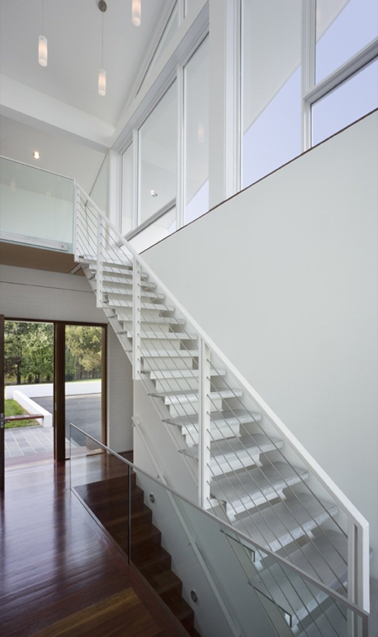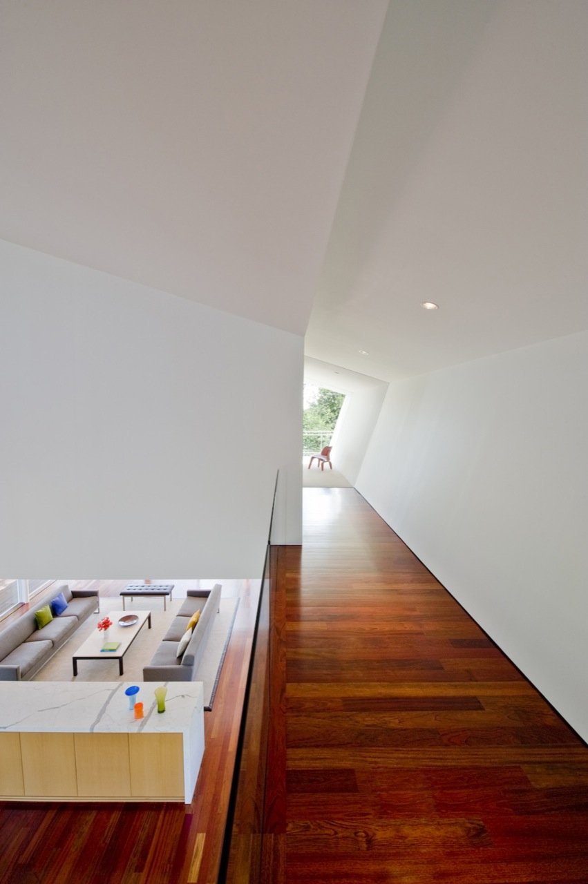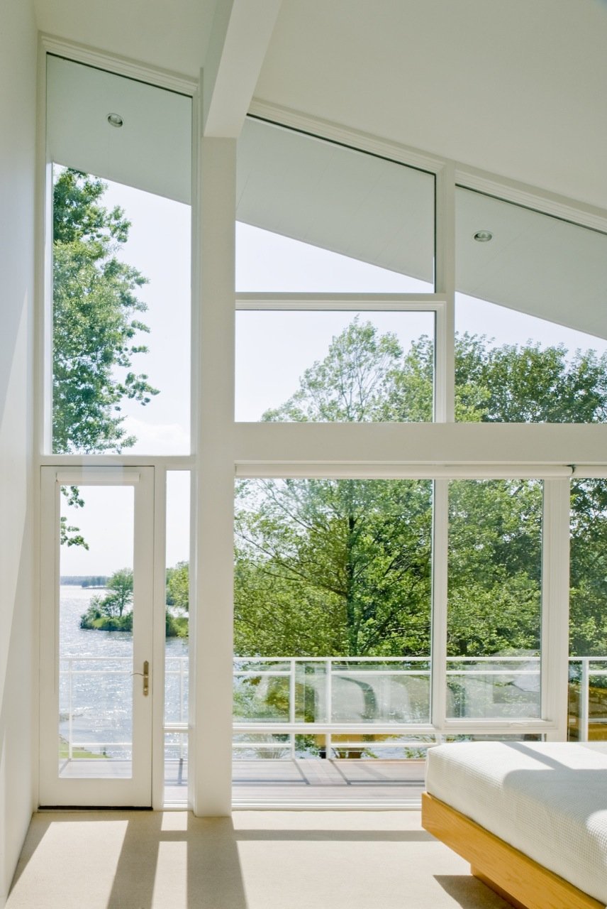 The second floor roof and exterior walls are wrapped in copper with fully glazed east and west walls inset from the ends of the copper volume. The glazed wall at the east end provides an abundant and high source of light into the double height entry hall while the glazing on the west end provides light to two bedrooms and views of the lake.