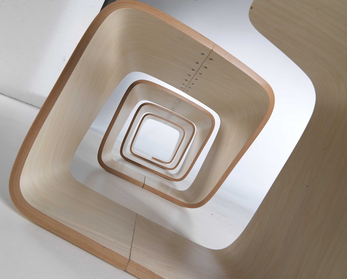 Inspired by the dynamic forms of biogenetics, the modular bench DNA consists in a unique construction assembly which is created by a single section of curved plywood, that is mirrored in design to create multiple seating configurations. The result of this system, is a captivating piece of furniture, shaped after the helix form, in which each completed section creates an individual seat for the user creating comfort in a public space.