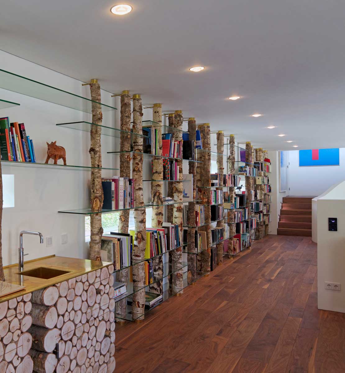 This idea is continued in the interior. The floors, in the same concrete colour, have different finishes, from roughly sanded to highly polished depending of the character of the space. The special brickwork establishes, besides the many pieces of art, a painting on its own. The surrounding forest becomes a part of life in the house because of all the glass. In certain places inside and outside are literally connected with each other. The rough concrete floor from the courtyard continues to surround the swimming pool and Piet Hein Eek built a bookcase for the office space from harvested birch trunks and glass panels. The same birch trees in the garden, design by OSLO, define the atmosphere in the area between the villa and the street. The garden stems from the design and materialisation of the villa, cultivates in the courtyard with connections to the existing forest.