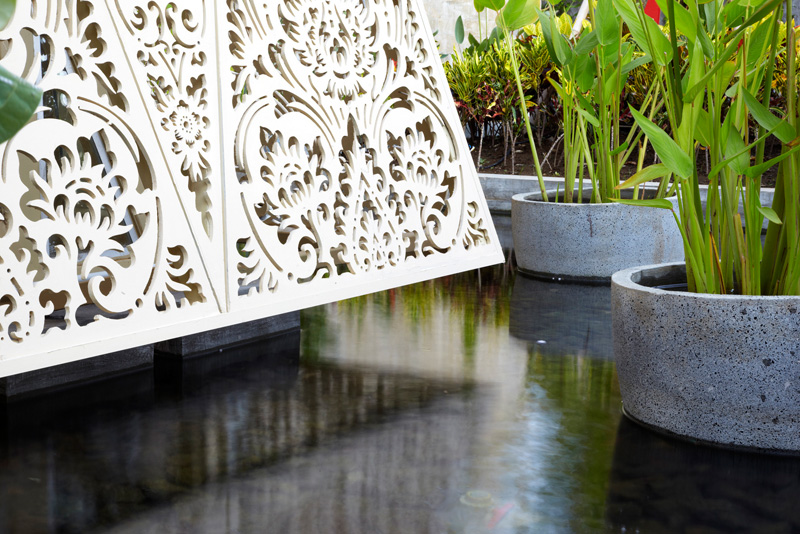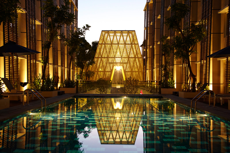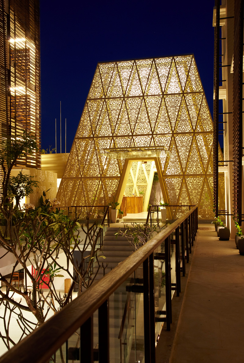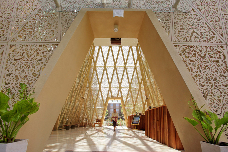 Guests arriving at the Ananta Legian Hotel in Bali, Indonesia, enter this pyramid-like building, where they find the check-in desks, and then pass through to the rest of the hotel.
