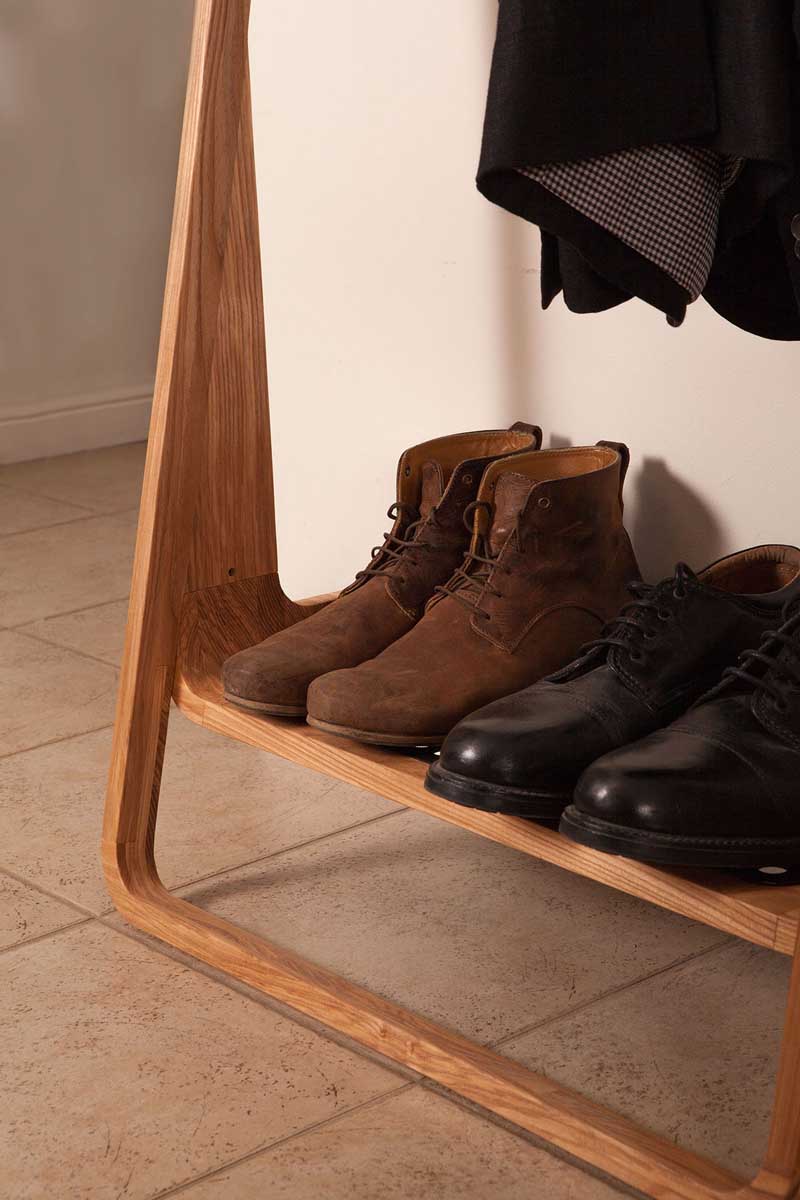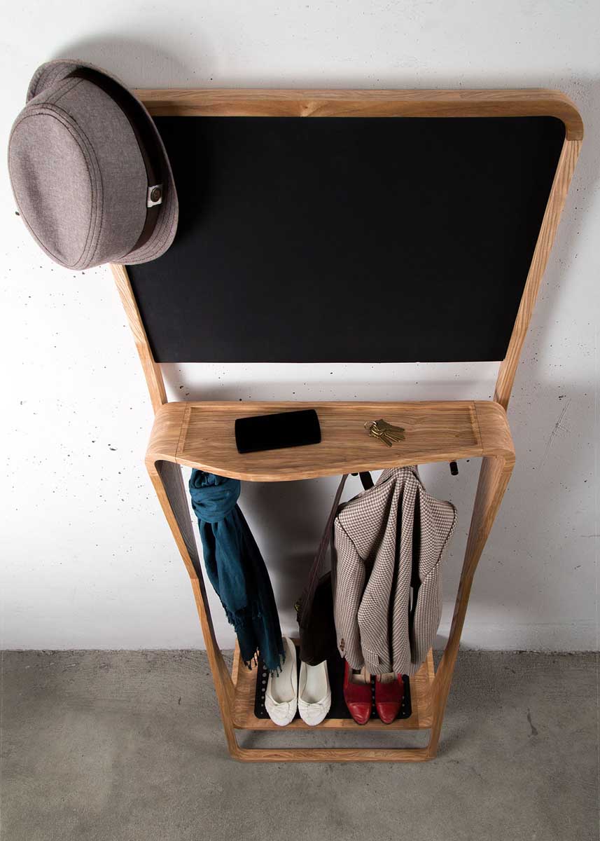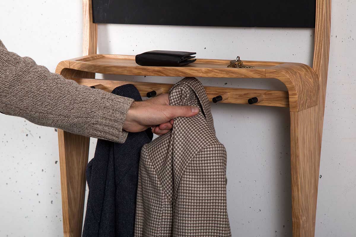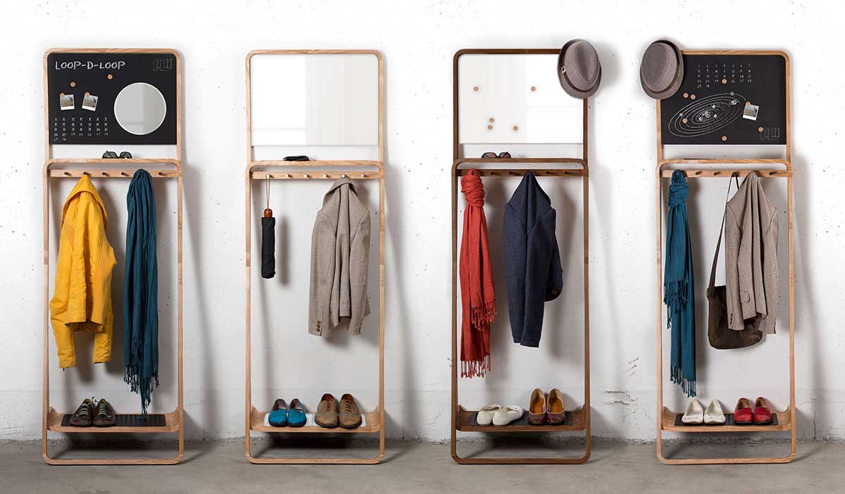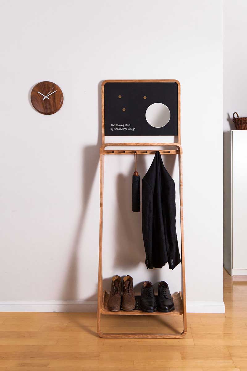 The Leaning Loop is a multi-purpose upright organizer made of solid hardwood. It is a handcrafted modular clothing hanger, bag holder, gadget shelf, mirror, magnet board, key holder, and shoe shelf all in one slender package.