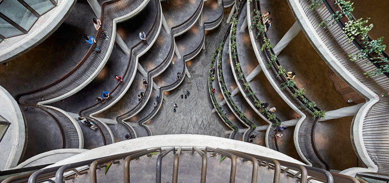 The hub’s form is dictated by its function, and brings together 56 tutorial rooms into a structure without conventional corridors, which have traditionally created social separation and isolation. The learning hub is porous- students can enter from 360 degrees around into a large central space which links all the separate towers together. Each tower is made up of a stack of classrooms which build up gradually, with gardens on selected floors.