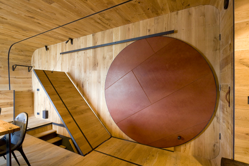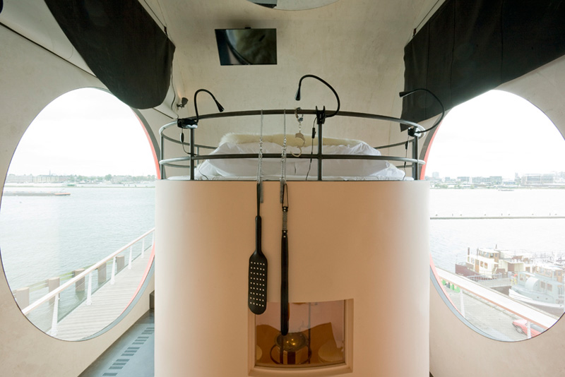 For the interiors of the letters MMX came up with the idea to challenge several designers. Richard Hutten designed a half-pipe in the B, Ronald Hoofd (&Prast&Hooft) was inspired by the book L’ Histoire d’O for O and architect Moriko Kira turned the L into an oasis of calm. Designer Jord den Hollander made the smallest cinema of the Netherlands in the E, and MMX-architecten saw in the top room of the T the captain’s quarters of Botel.