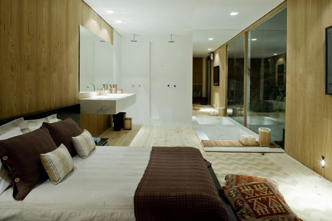 The project is composed by a large living room / dining room, which also works as a balcony. The room and the bathroom are in the same environment, having only the toilet hidden. The bath is open to the outdoor garden with a huge glass panel. The kitchen, which has no divisions, is located on the opposite side of the room and it is integrated with the dining room.
