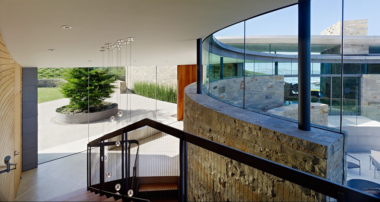 The large area of the house was disguised by splitting the house into two wings, recessing the house into the site and locating nearly half of the space partially underground. The plan-split created a courtyard, the eastern wing providing privacy from Highway One and the western wing buffering the ocean wind. Secondary spaces are located on the lower floor and borrow light from above through three staircases. These spaces provide respite from the panoramic drama on the upper floor.